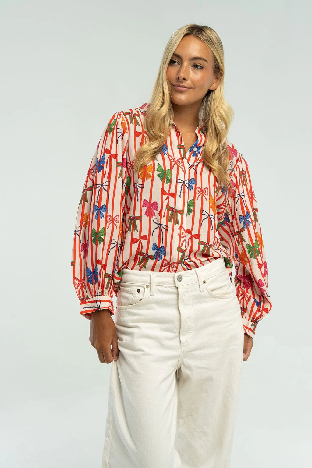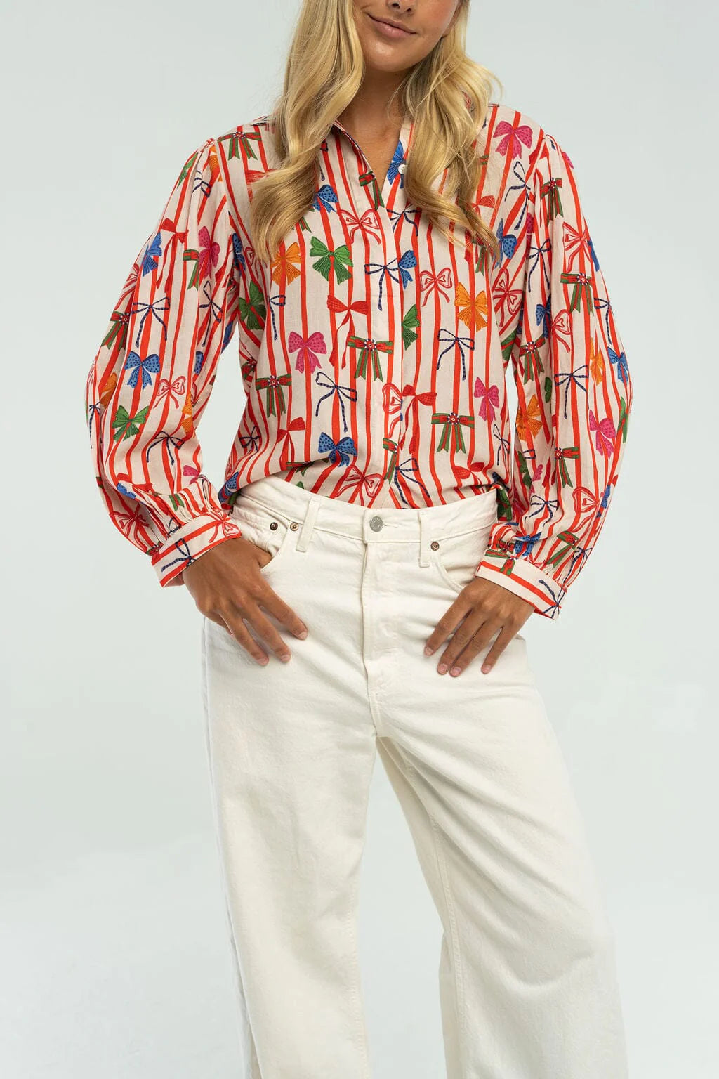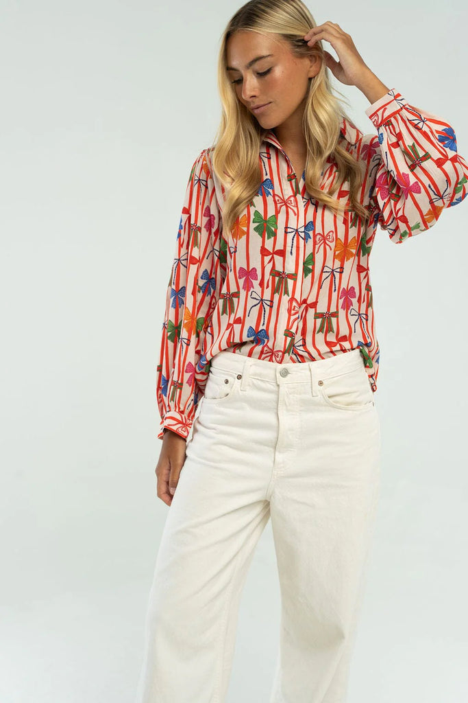 Bright, bold, and effortlessly chic, the Christy Top brings playful sophistication to your wardrobe. Featuring a colorful bow-and-stripe print, this button-down blouse is designed with a relaxed fit, collared neckline, and gently puffed sleeves for a touch of volume. Pair it with denim or tailored pants for a fun yet polished look that stands out in any setting.