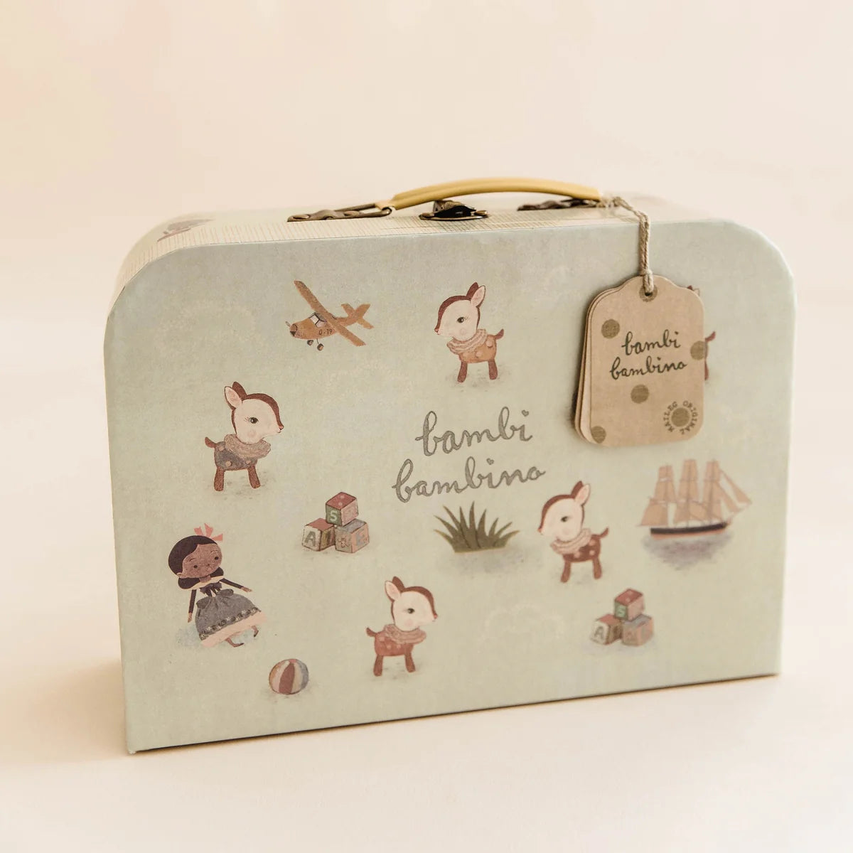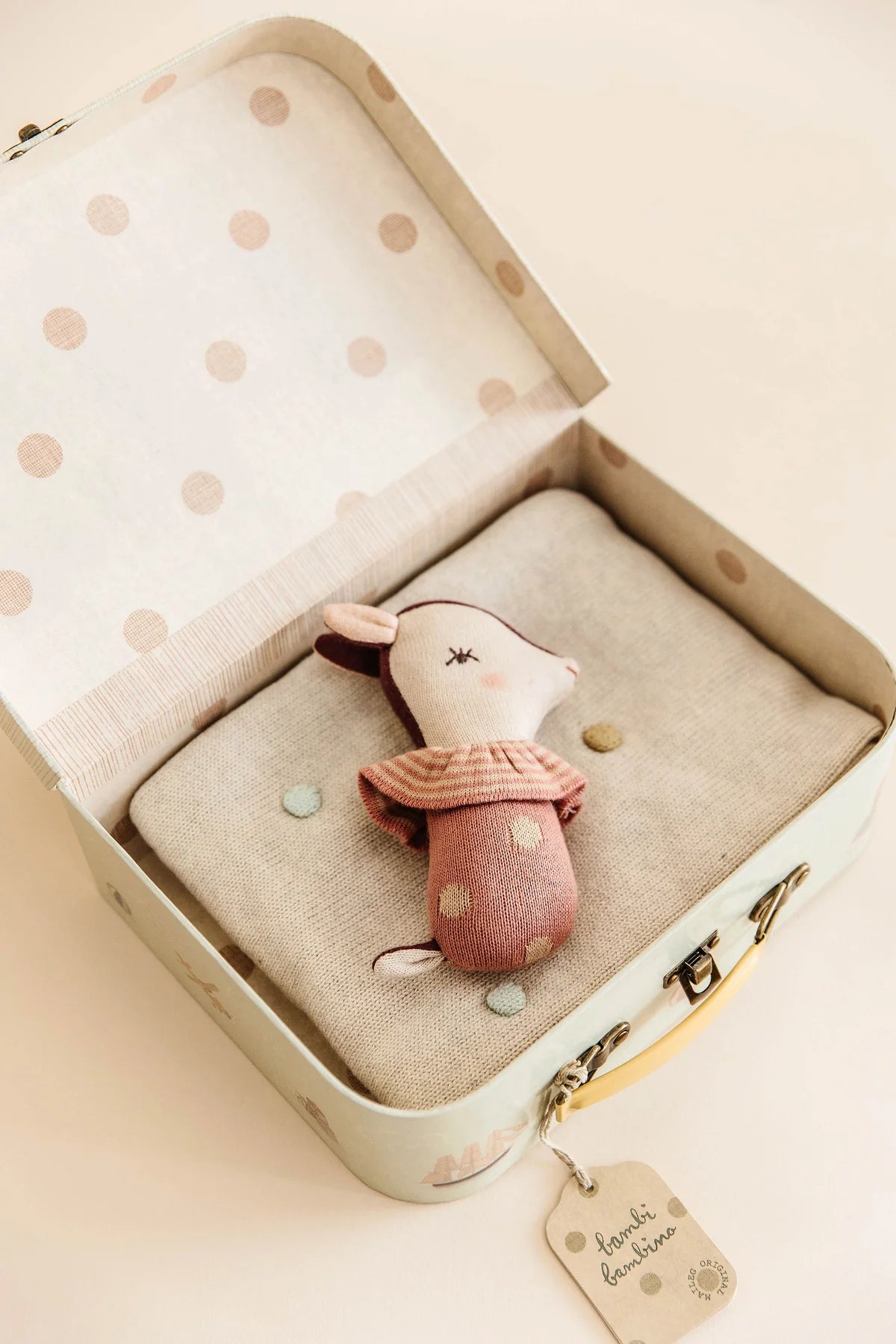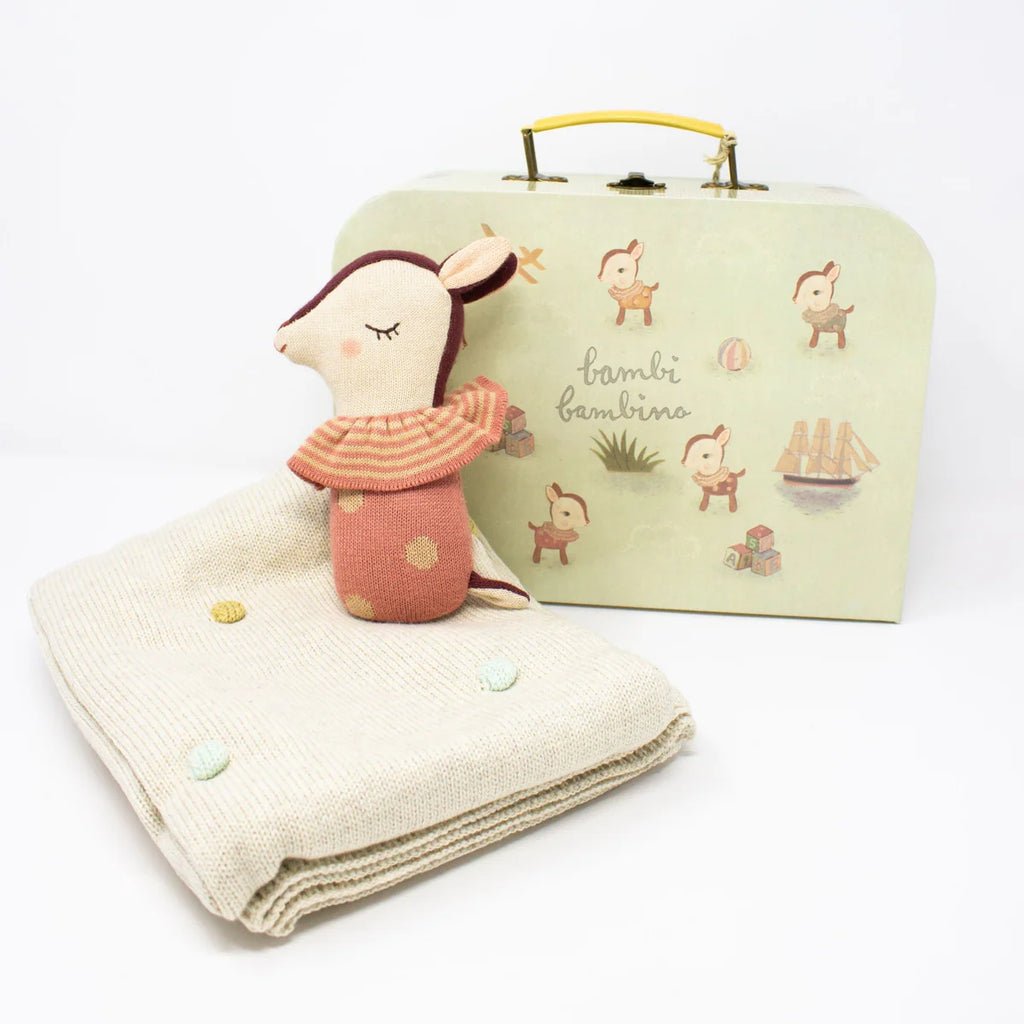 This beautiful baby gift set includes a Bambi rattle and a soft knitted blanket both in cotton. It is packed in a nicely decorated handmade suitcase.