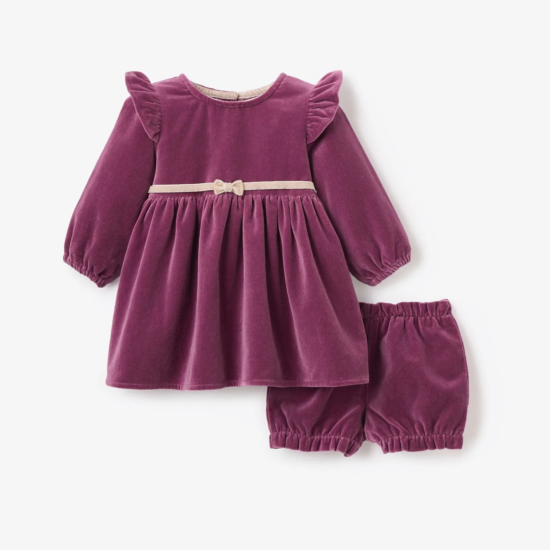 DARK VIOLET VELVET RUFFLE SLEEVE DRESS - ELEGANT BABY