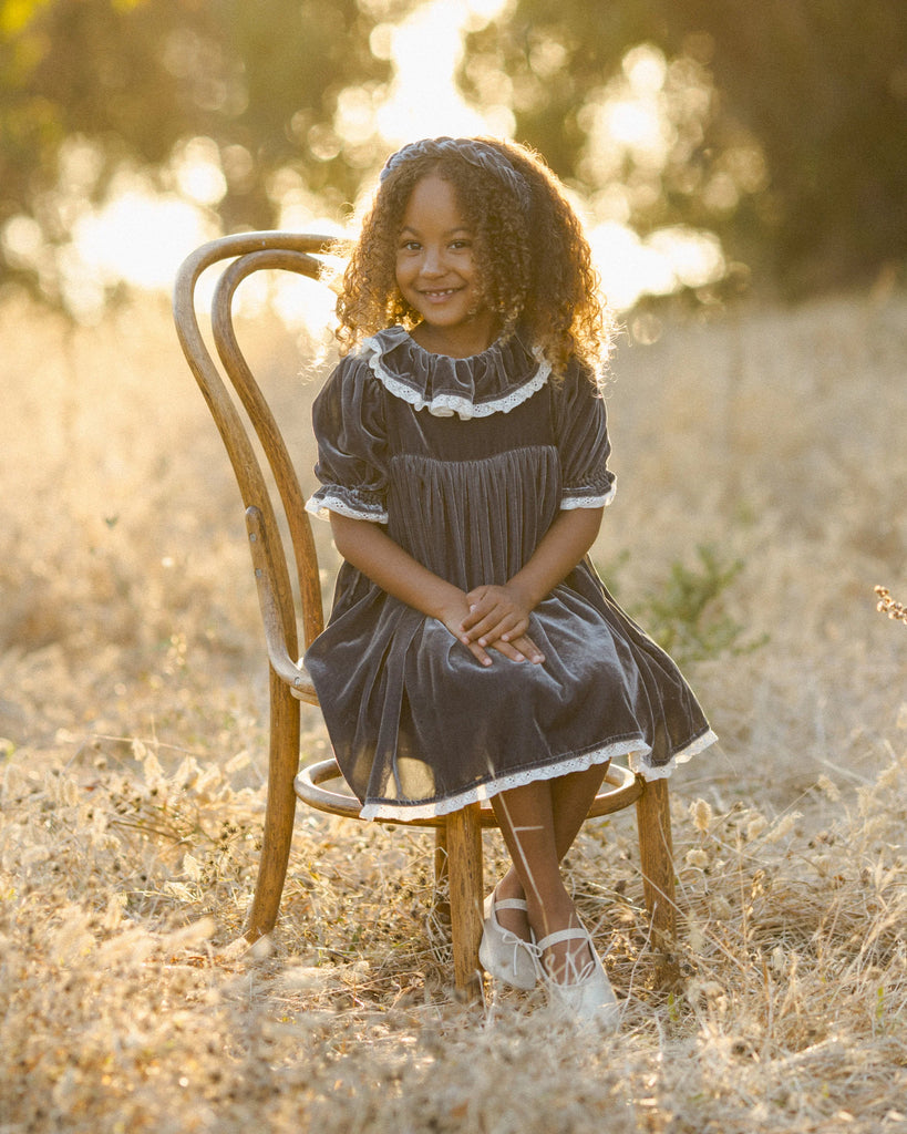 Our Amelia Dress has a sweet collar along the neck that is framed by sweet bubbled sleeves and scalloped detailing along the bottom of the dress. Button closure down the back of the dress.