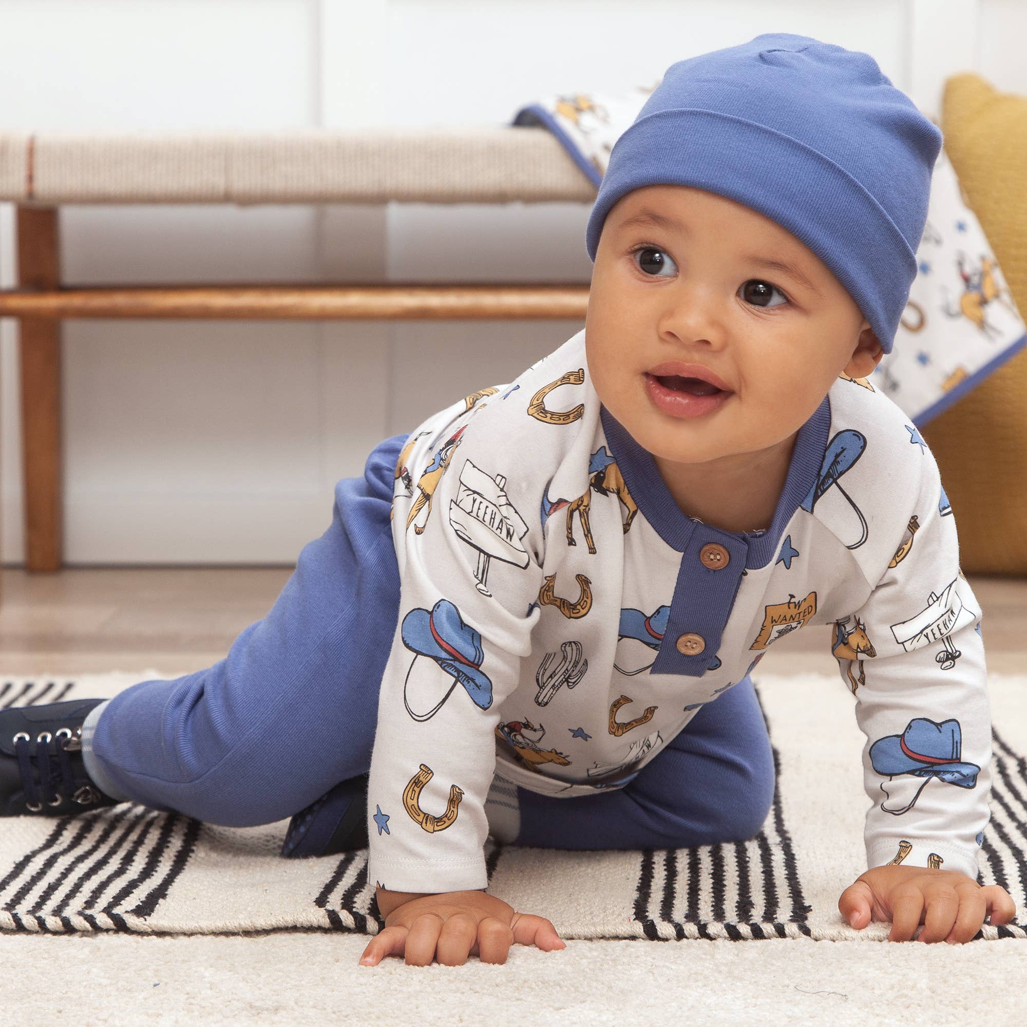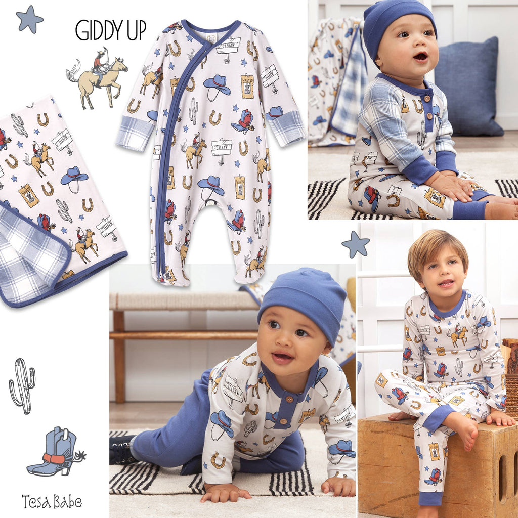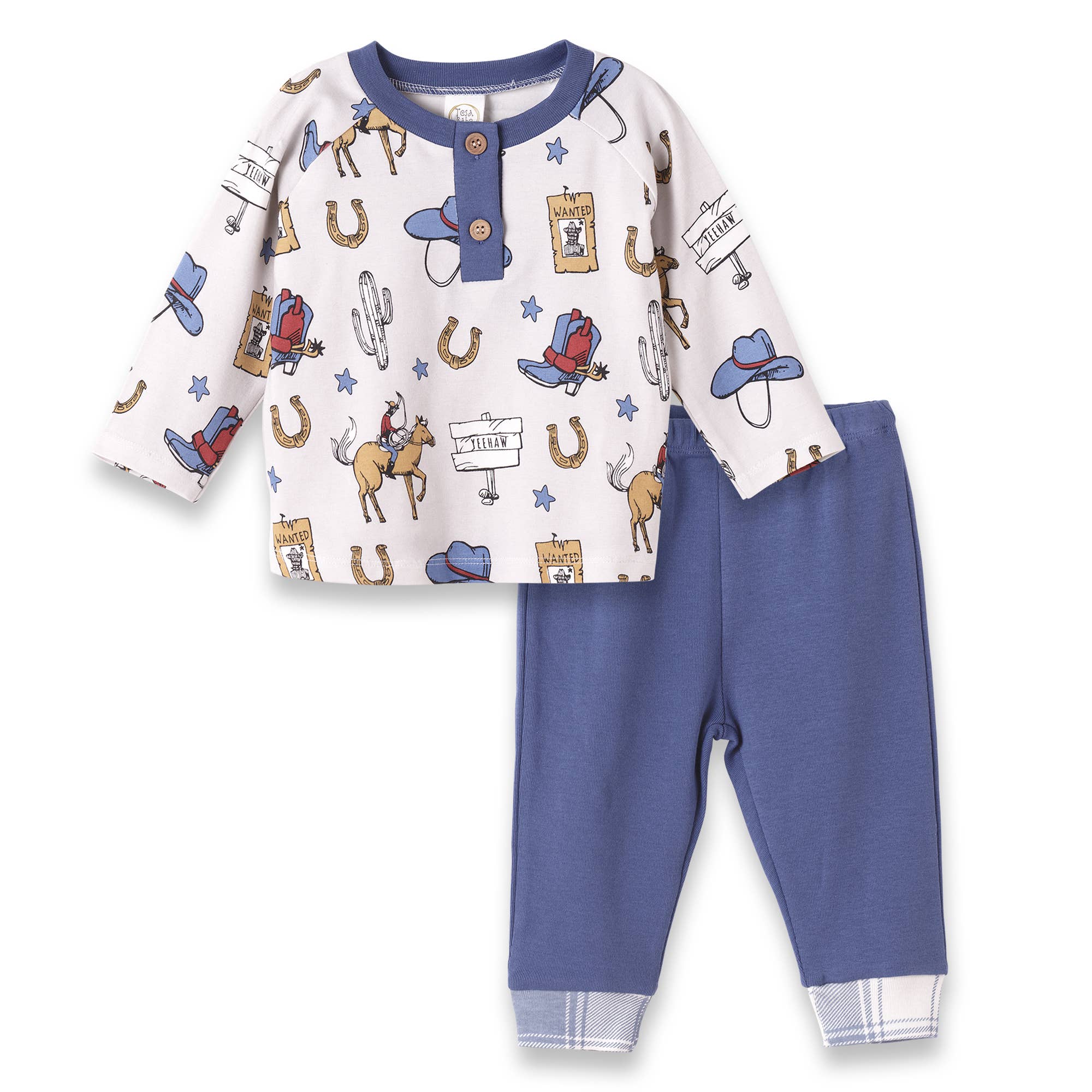 Yee-haw! Saddle up for some wild fun with this on-trend cowboy-inspired top and pants set. Boasting a luxurious mix of bamboo-cotton blend fabric and elasticized waistband, this luxe-y and stretchy set is soft, sweat-resistant and made with eco-friendly goodness.