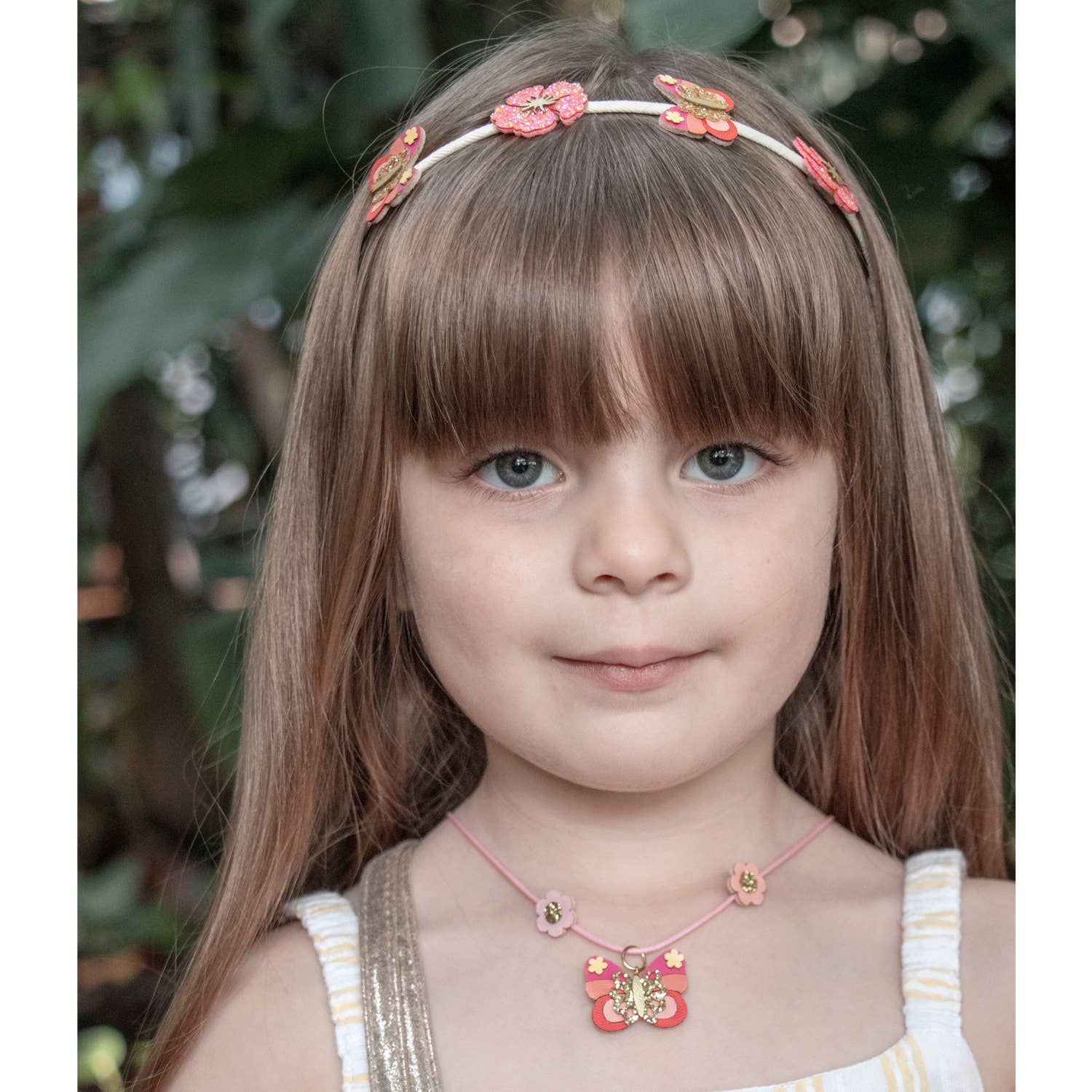 Flutter like a butterfly with our Bella butterfly headband. Adorned with our Bella butterflies and shimmering hibiscus flowers sat upon a mink ribbon wrapped metal headband. The perfect headband for those spring days! Matching hair accessories also available. Made with recycled felt, ribbon, glitter and PU. Not suitable for children under 36 months due to small parts. Style code: H2350M
