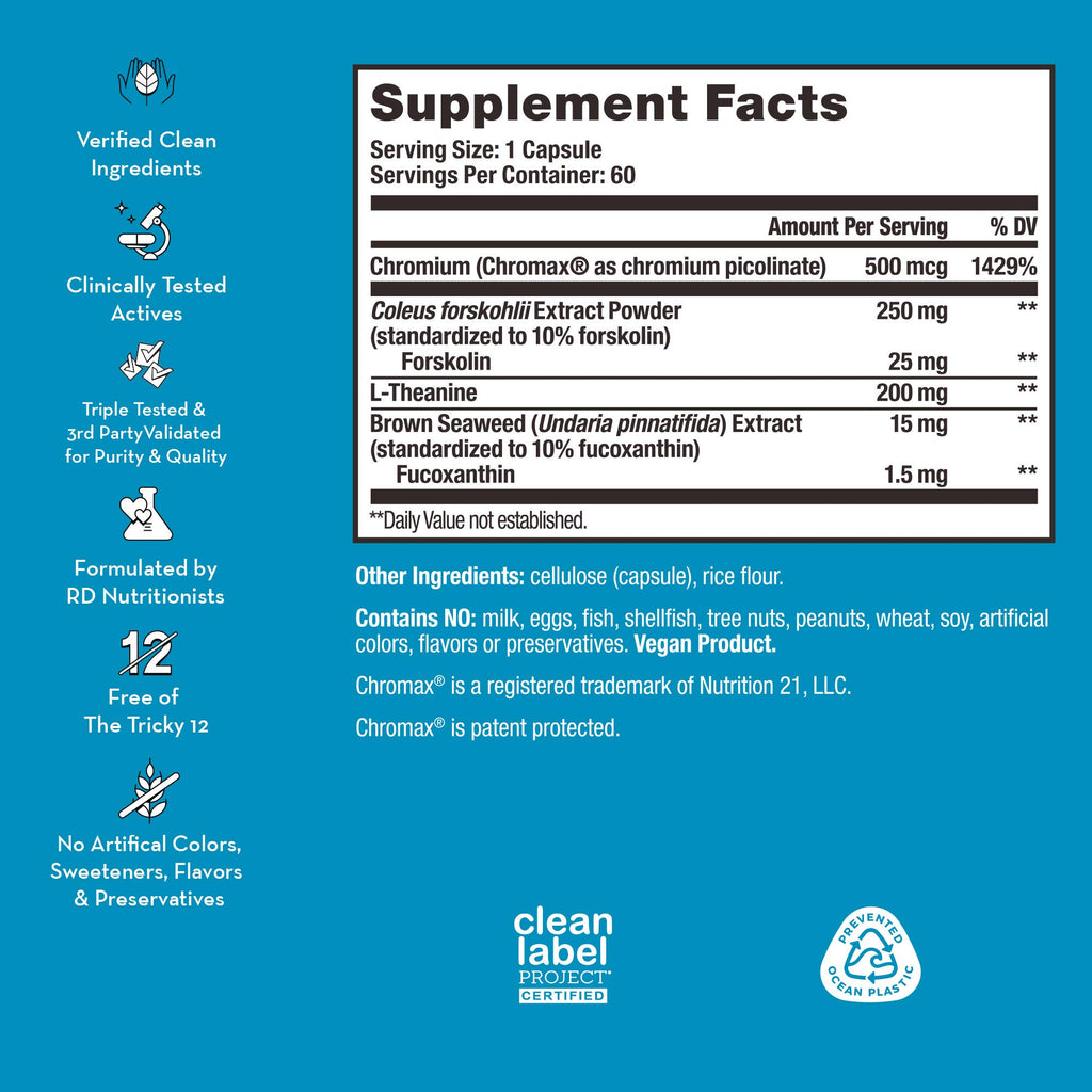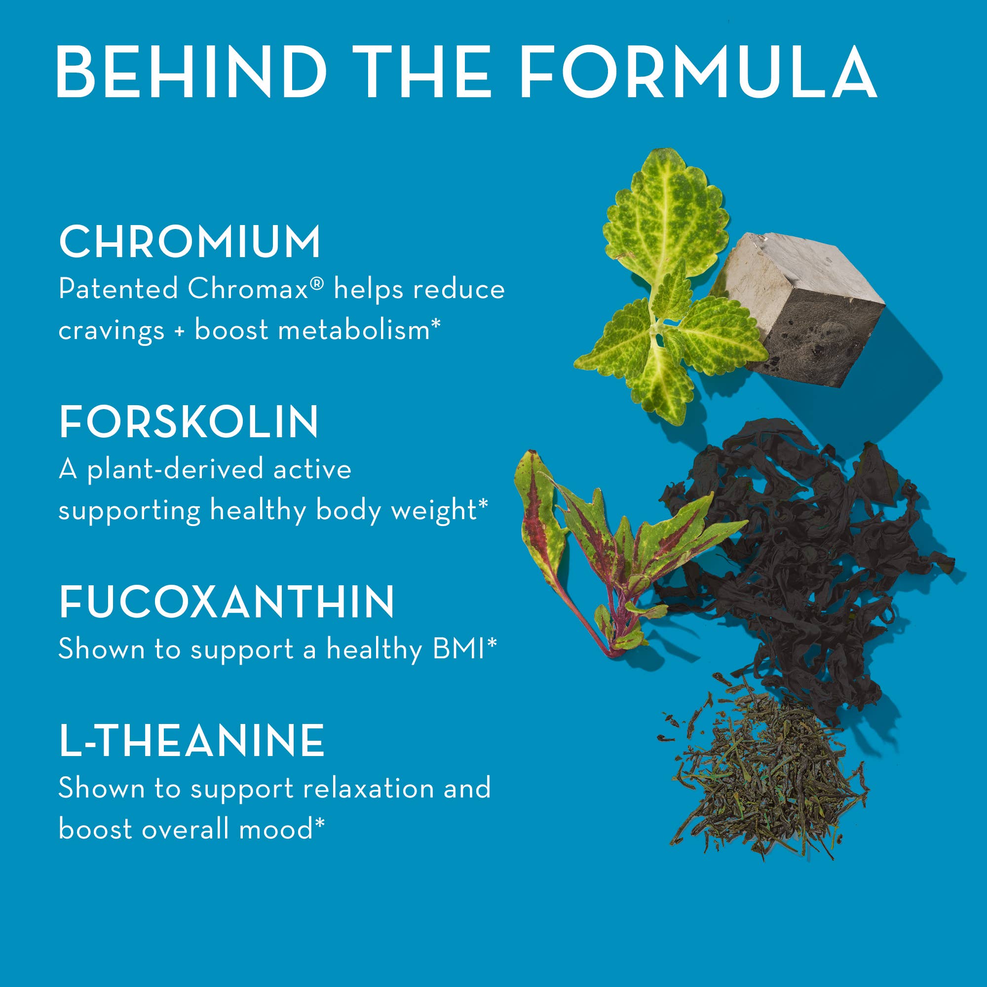 A caffeine-free blend of chromium, seaweed extract + L-theanine to naturally support balanced blood sugar for reduced cravings and boosted metabolism.