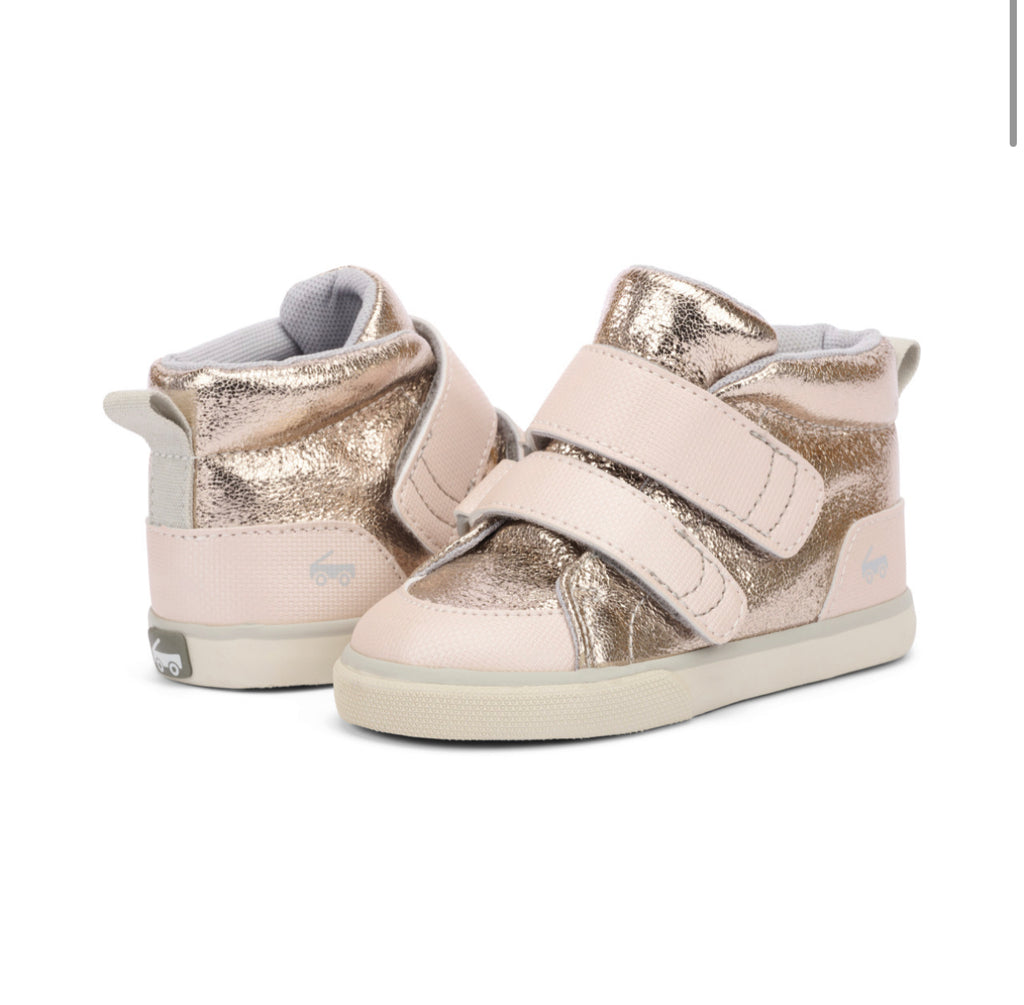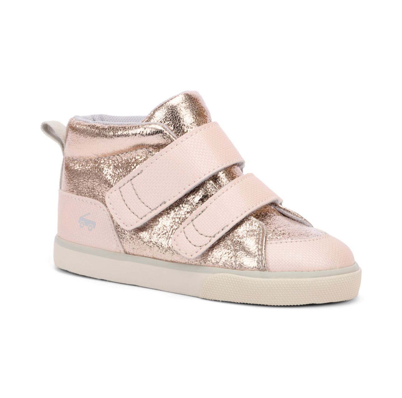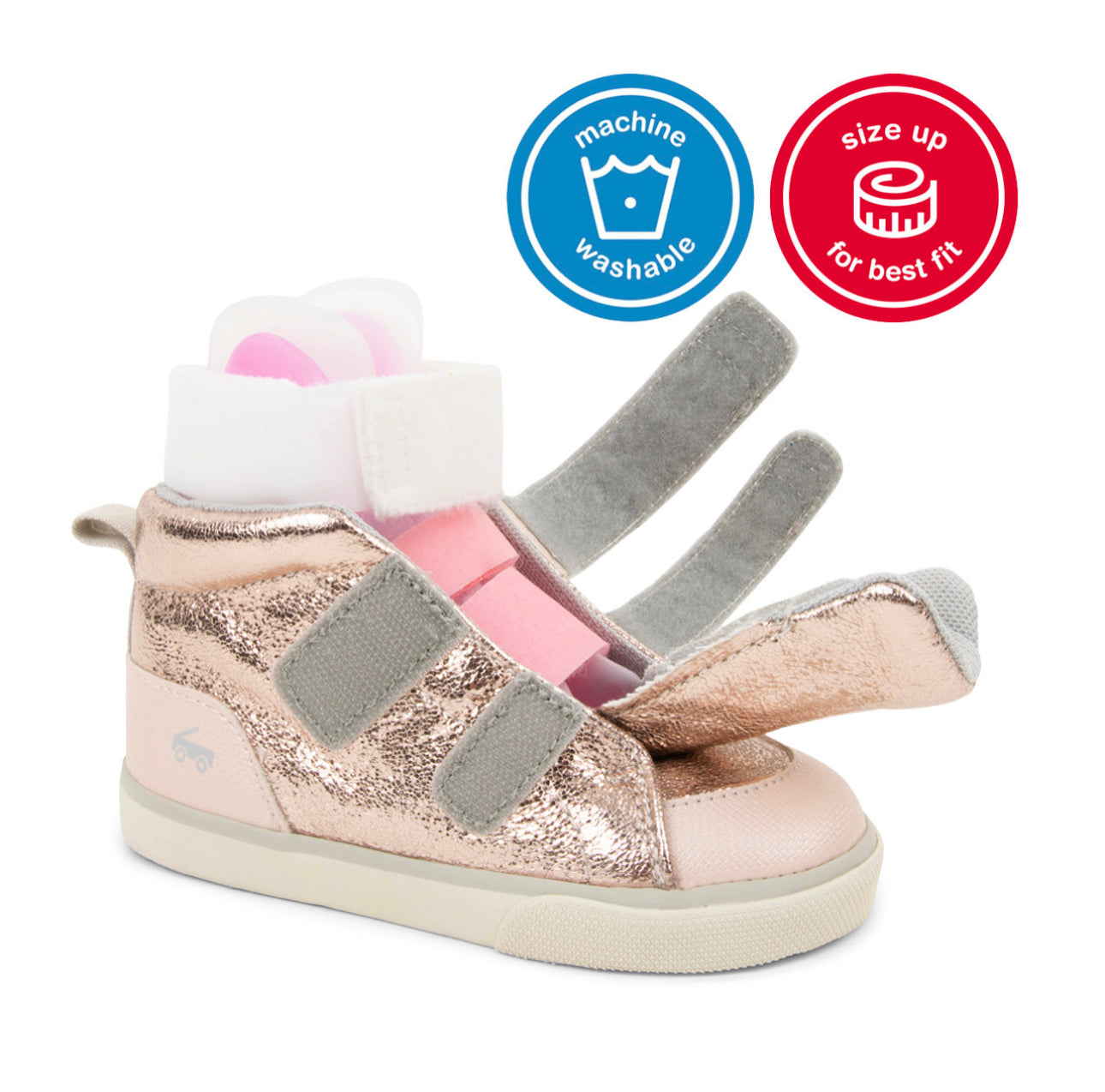 Specially designed to accommodate orthotics such as AFOs, SMOs and custom insoles, The Dean Adapt in rose gold high top sneaker is customizable for any child. Extra-long straps fit around orthotics but can also be cut to fit. A removable insole provides extra space if needed. The sneaker opens super wide and stays open thanks to the oval ring hinge design. 42% of this shoe is made with recycled materials.