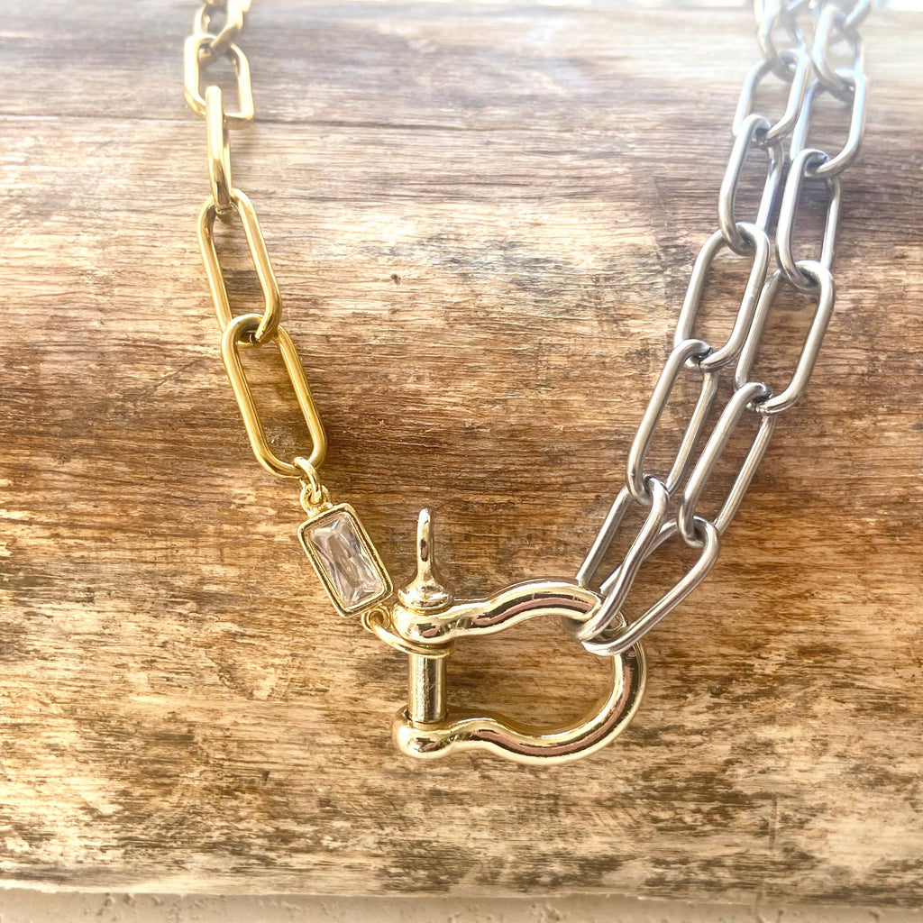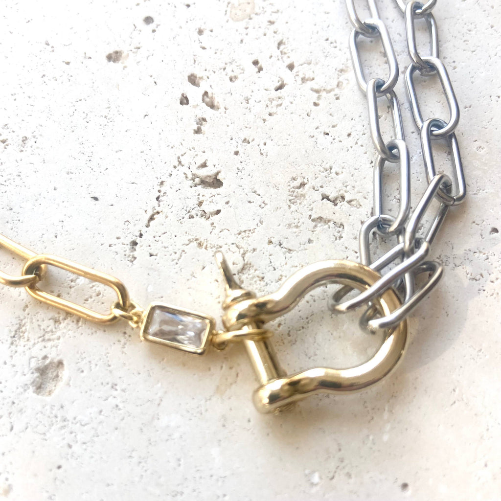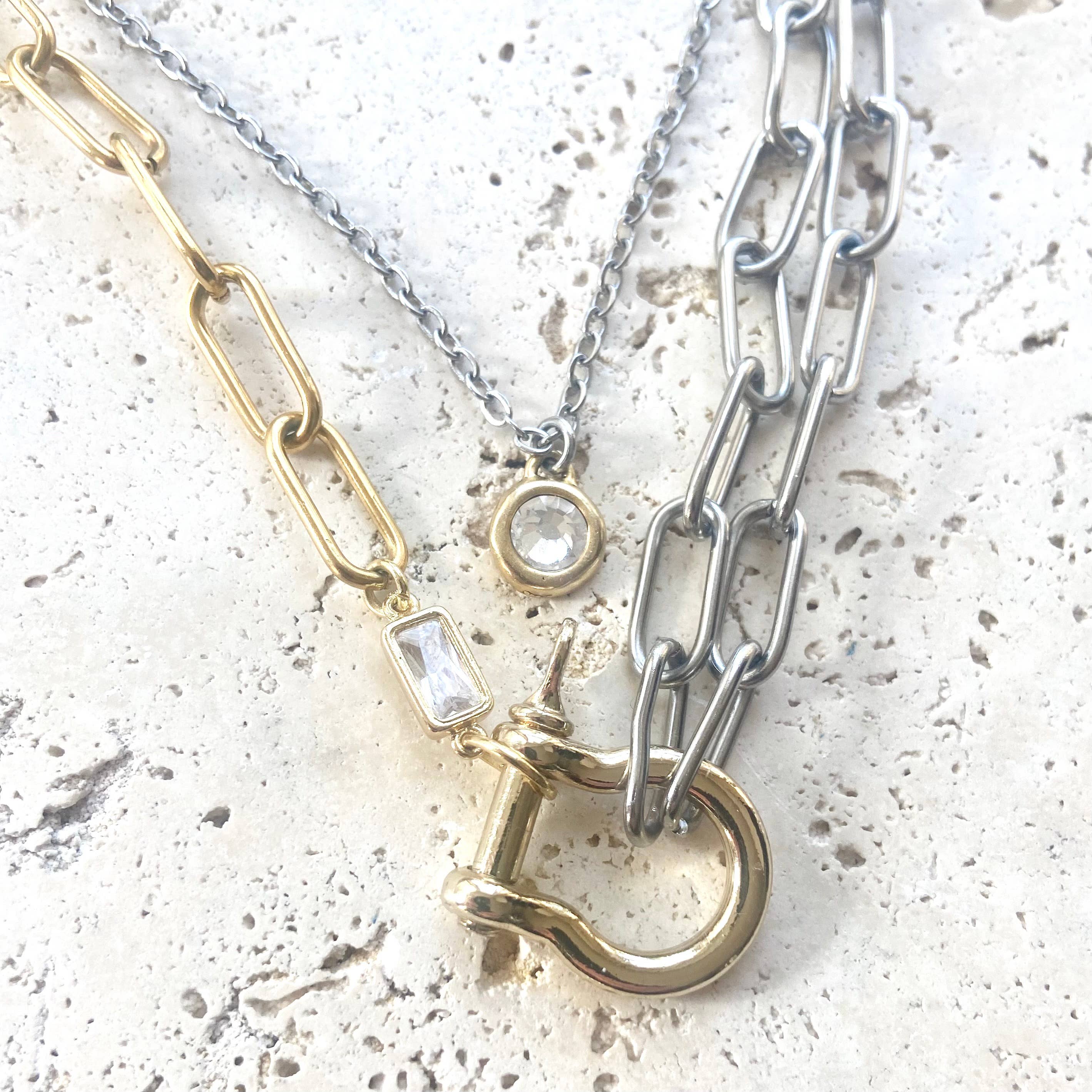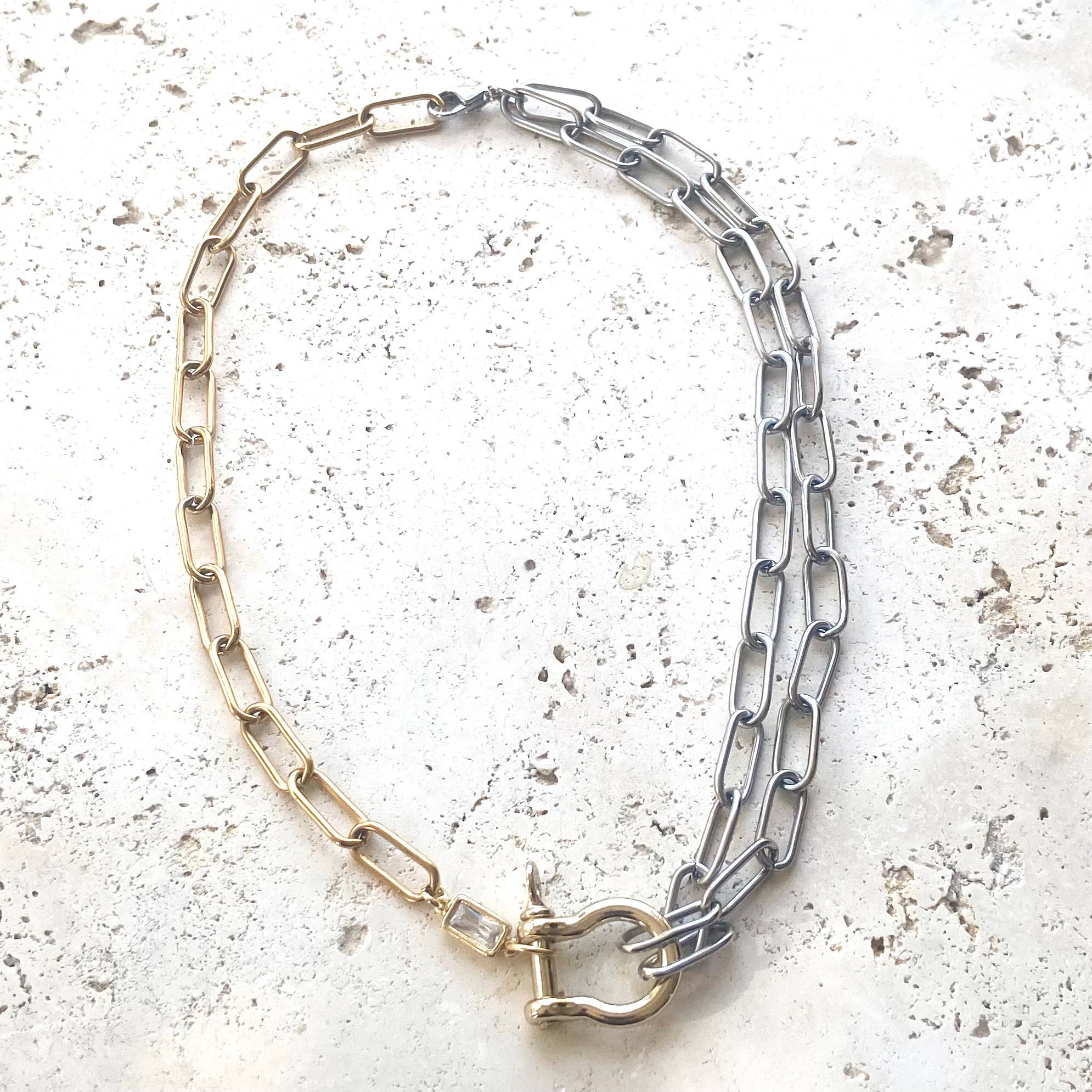 This necklace is so edgy glam and fun to wear. It features chunky paper clip stainless steel chains and a functional marine shackle clasp that you can wear alone or add your favorite charms or pendants. Lobster clasp closure at the back. 17”