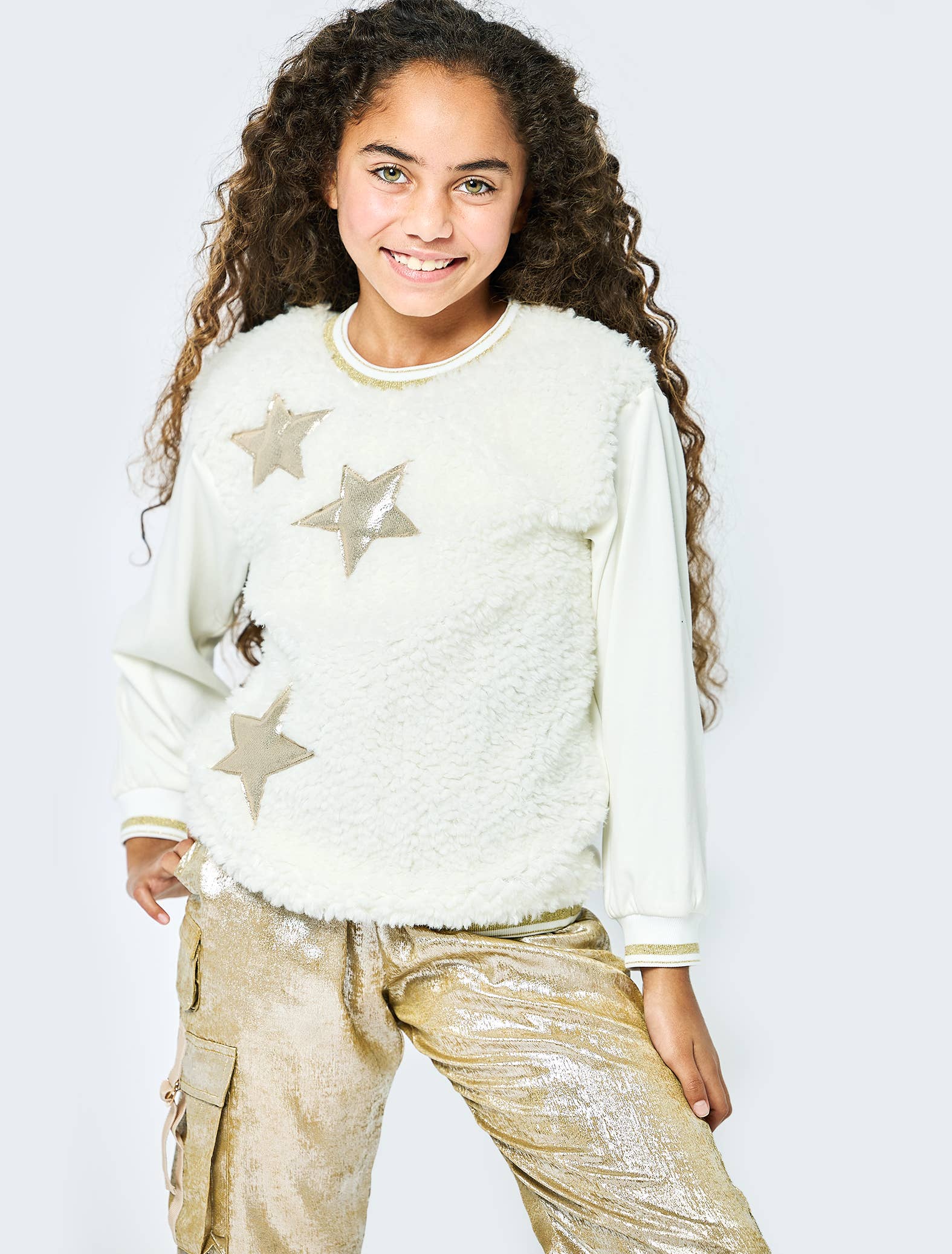 Dress your child in style with the Hannah Banana Faux Shearling Tunic with Metallic Stars. This unique tunic adds a touch of glamour to any outfit with its metallic stars and high-quality faux shearling. This trendy top is designed with careful attention to detail and features novelty trims that set it apart from other shirts. Perfect for everyday wear or special occasions, it reflects Hannah Banana's commitment to creating fashion-forward, yet sensible clothing for kids. This tunic is a stylish addition to any young girl's wardrobe, offering a unique look that's as unique as she is.