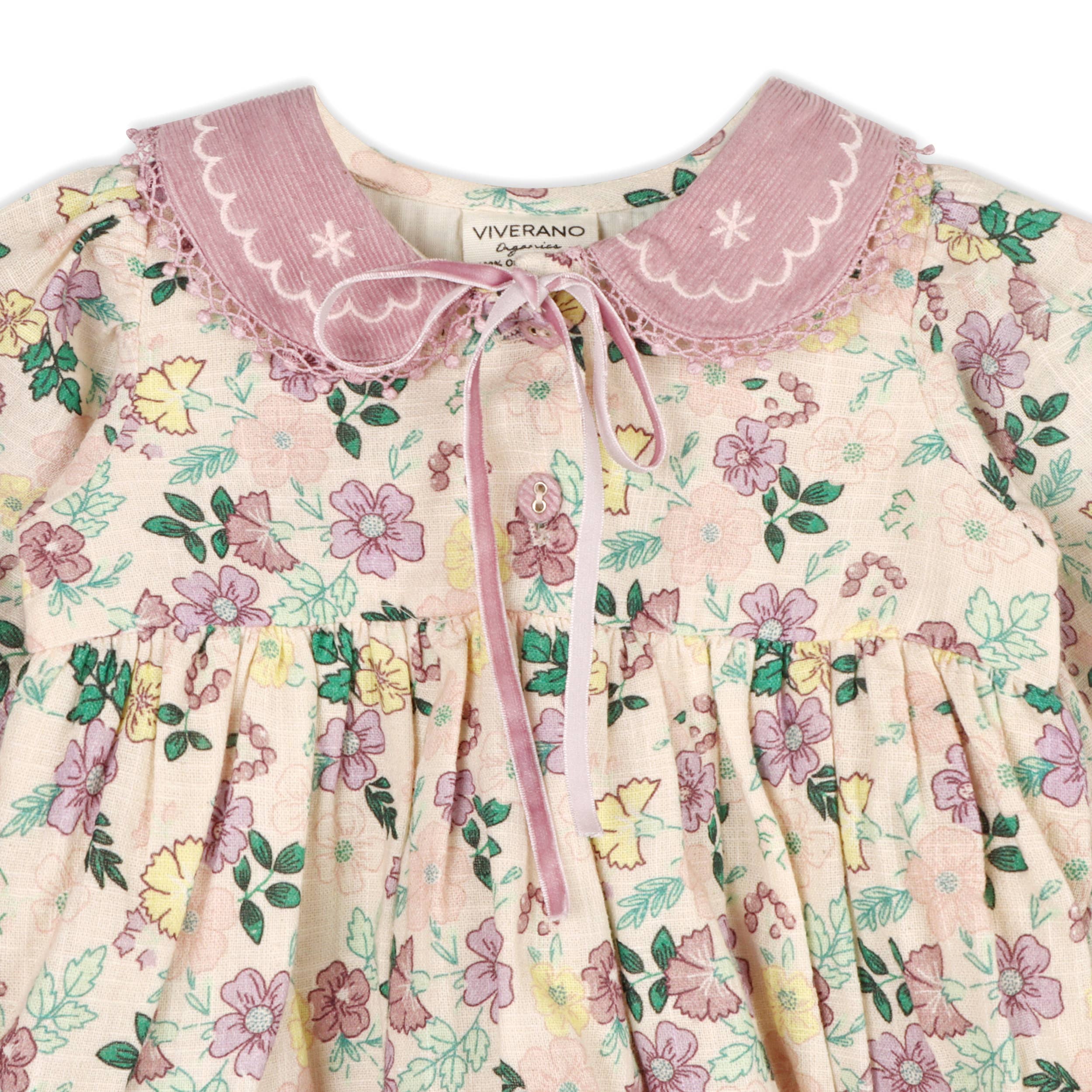 - Contrast lilac color corduroy collar with floral embroidery.