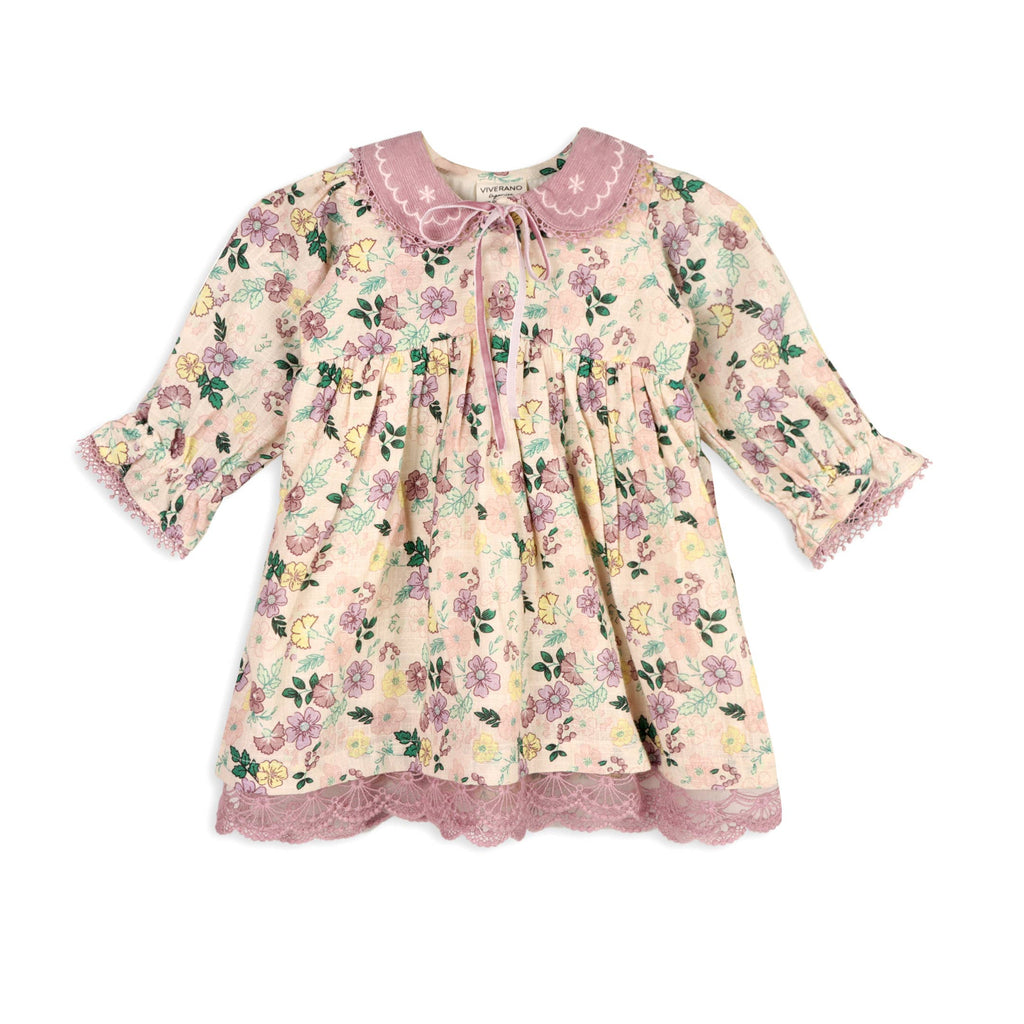 Colorful long sleeve baby flare dress & matching bloomer set, made with soft organic cotton slub fabrication, pretty all-over rose floral print.