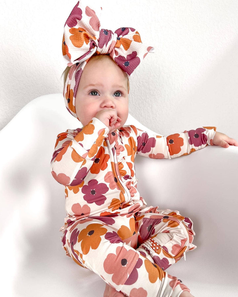 Soft and cozy, this Goldie romper made of bamboo and spandex will keep your little one comfy and stylish while the convertible zippers make it easy to take on and off. Let your baby shine like gold in this eye-catching one-piece! Our rompers have room-to-grow stretch, a 2-way zipper (this means easy diaper changes), and fold-over hand and foot cuffs. Heat-stamped branding (no itchy tags!) 😊 Fold over hand cuffs on zippies up to size 12-18. Run true to size with room to grow stretch. MATERIALS: 95% Viscose from Bamboo, 5% Spandex
