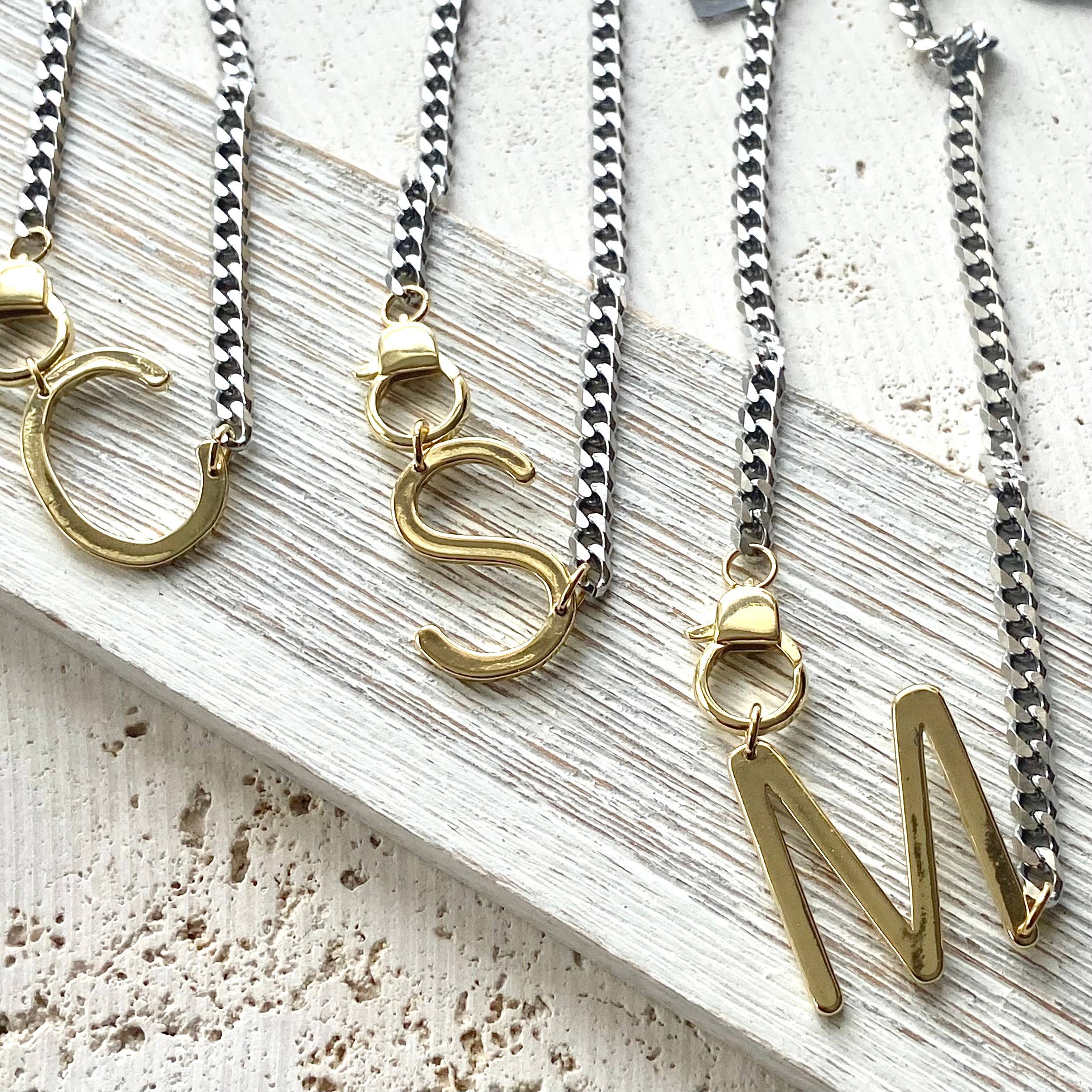 These statement initial necklaces are very edgy and fun to style with just about anything! Non tarnishing 19” chain. Letters are approximately 30mm. Easy to put on and off. The Layering rectangle necklace is sold separately. Choose your letters. If you would like a different length you can message us.