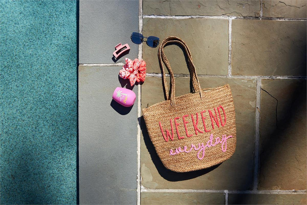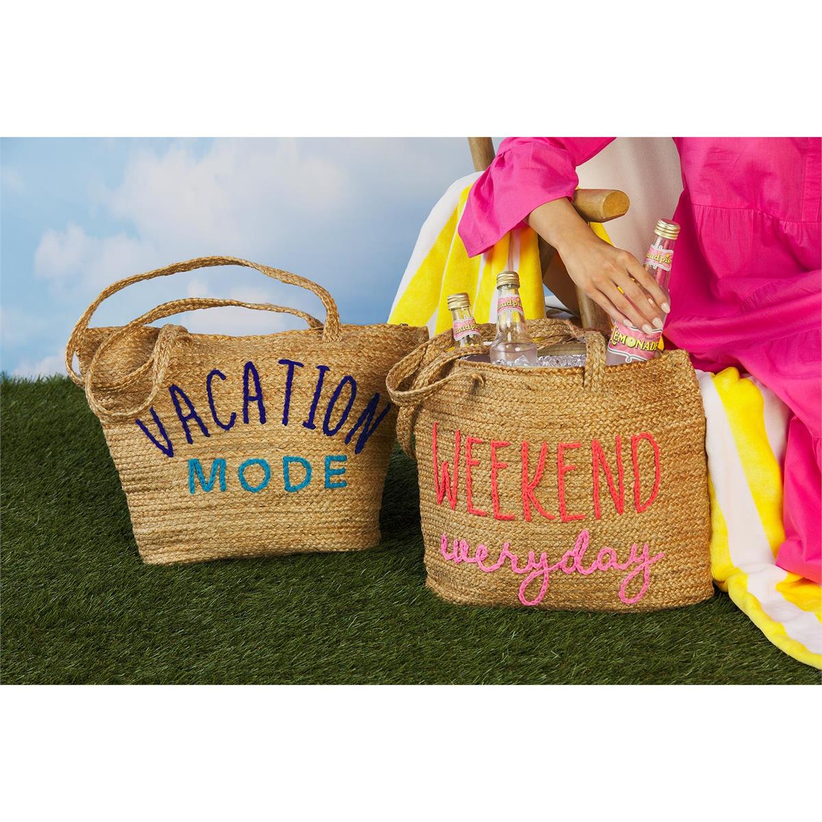 Treat every day as weekend with our Weekend Everyday cooler tote. The braided jute cooler tote arrives fully insulate, making it perfect for storing your favorite drinks or snacks. The outside of the tote features an embroidered word applique that says "Weekend Everyday" and a top zip closure.