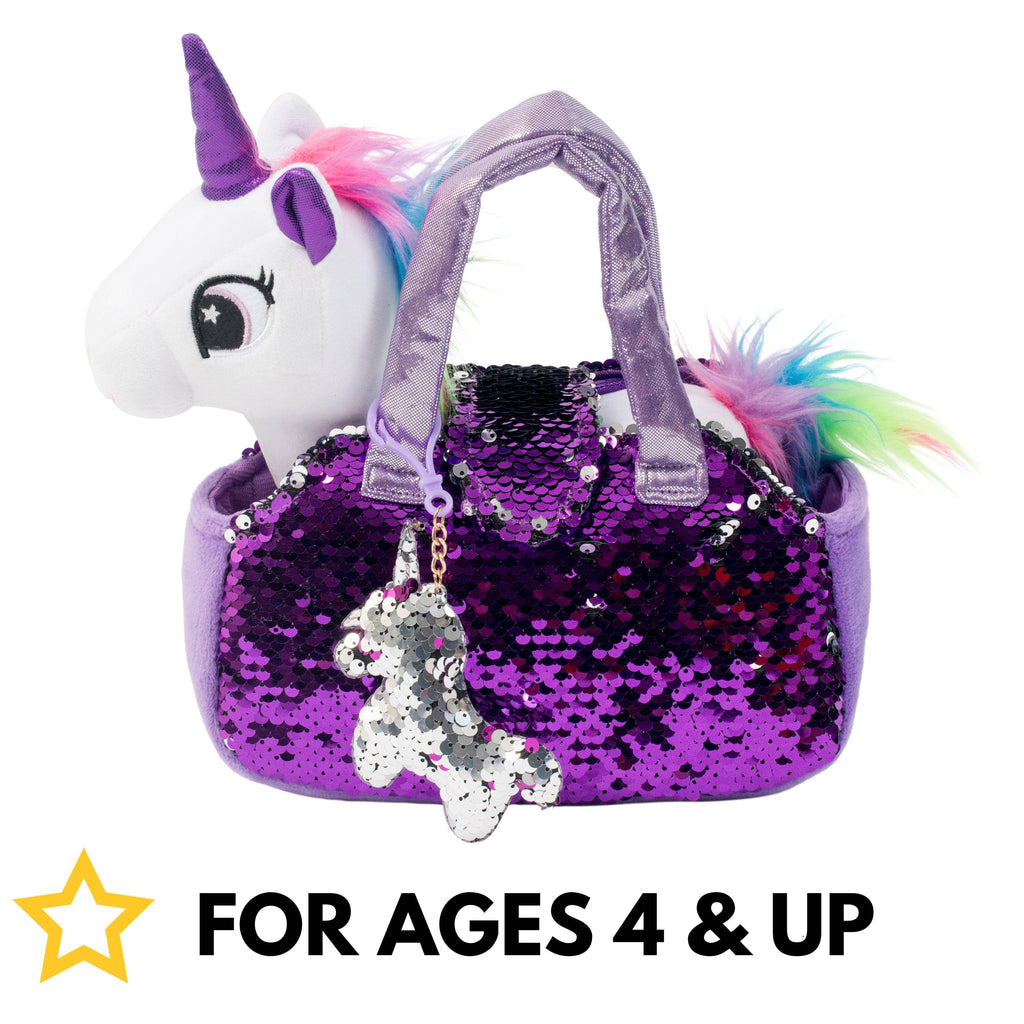 We understand and deliver with the Little Jupiter Purple Unicorn Pet Plush Set w/ Reversible Sequin Toy Purse. Kids will love the fancy charm and reversible sequins!