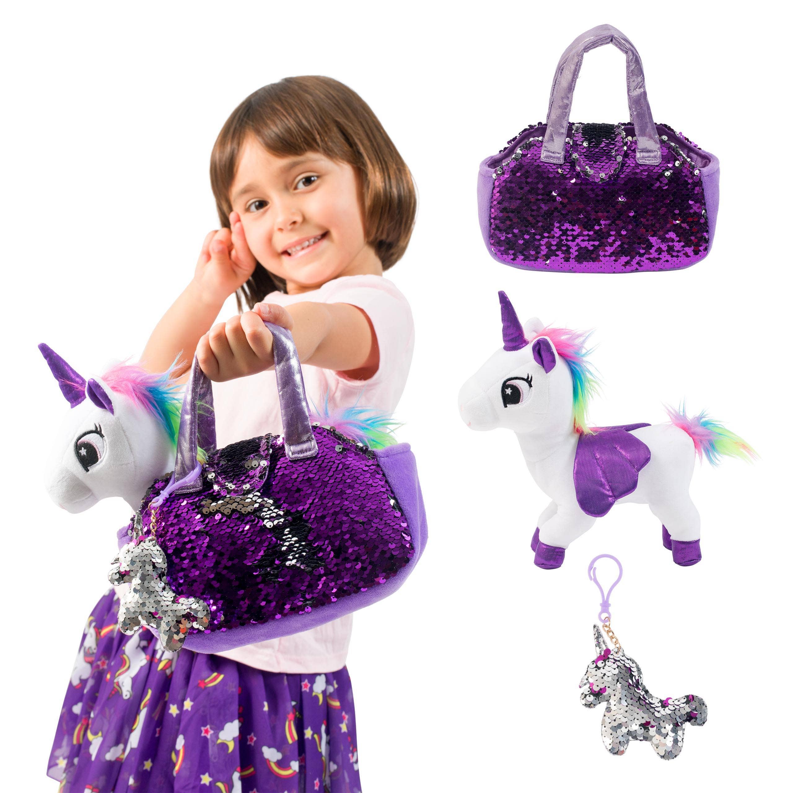 ✅ Complete 3 Piece set includes a unicorn plush toy, sequin carrier purse bag, and sparkly charm.