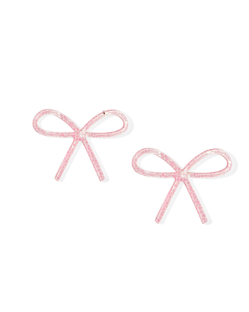 LINNY CO jewelry is safe for sensitive ears, light weight and made to last. Made from 100% surgical-grade stainless steel and eco-friendly acetate, LINNY CO is always copper and nickel free. The Lola bow hangs at an angle on the ear with a right and left stud. It is 45mm. Disco Pink is a light pink colorway with metallic shimmer.