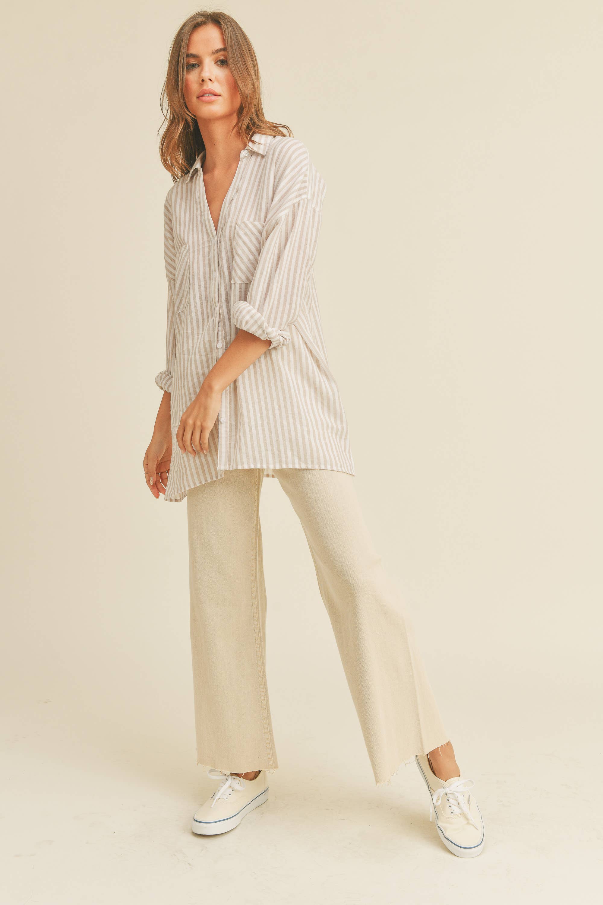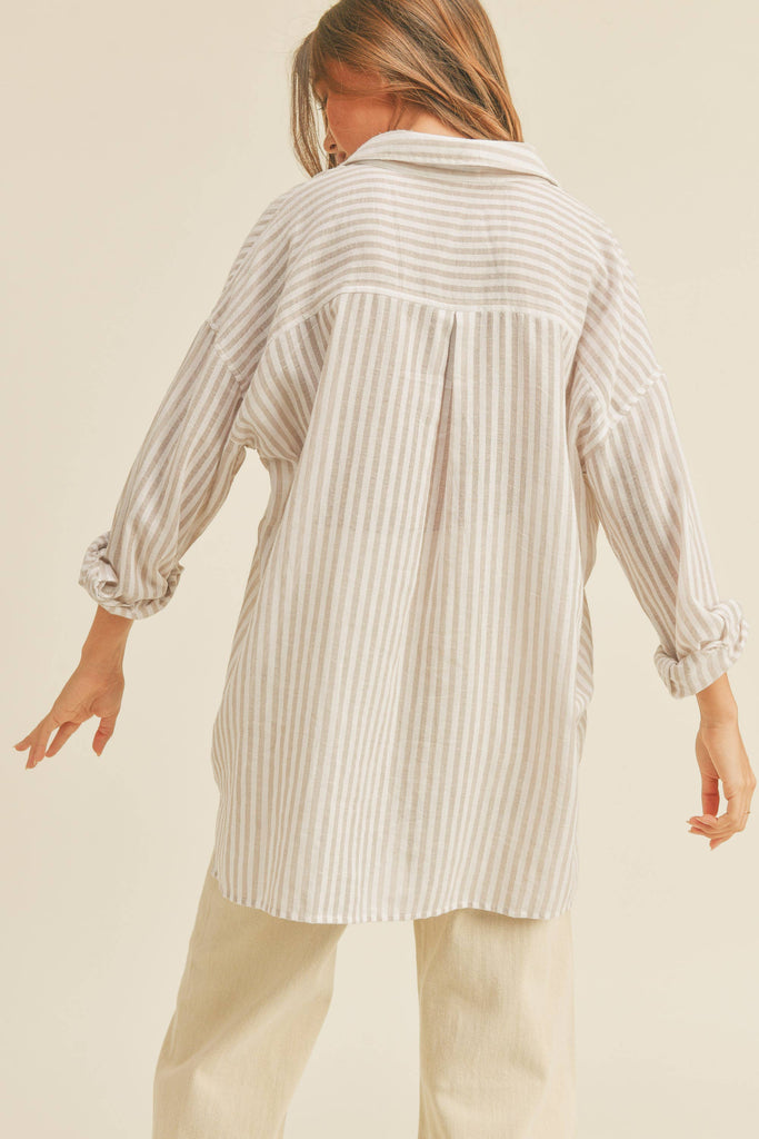 Introducing our versatile Striped Button Down Shirt! Made with long sleeve cotton and a classic white with beige stripes design, this shirt is a wardrobe staple for all seasons. Perfect for layering underneath our cozy knits, this shirt is both stylish and practical.