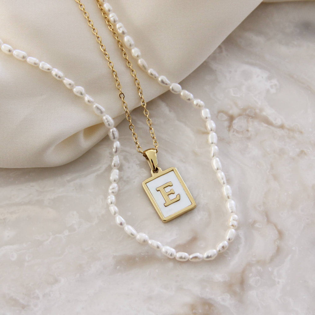 • This listing is for one (1) necklace with one initial. Pearl beaded necklace is sold separately. Second and Third photos shows the Mother of Pearl Initial Necklace layered with our Freshwater Pearl 2.5-3mm Necklace which is available here: https://www.faire.com/product/p_325vsgstlq?bQ=pearl&refB=1