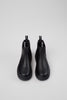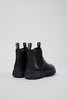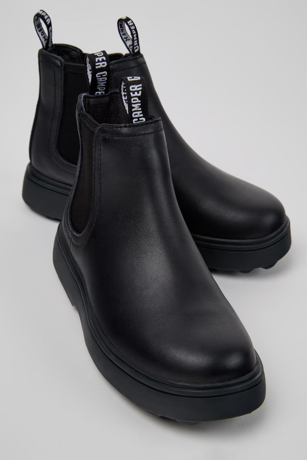 Black calfskin leather kids' ankle boots with OrthoLite® Recycled™ footbeds and rubber outsoles.