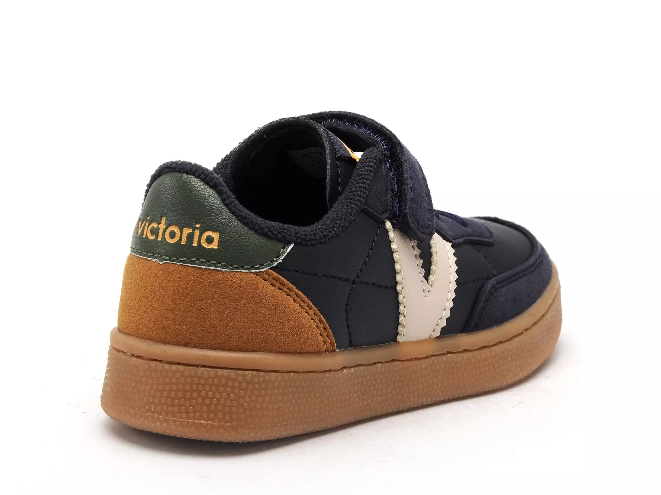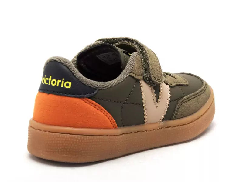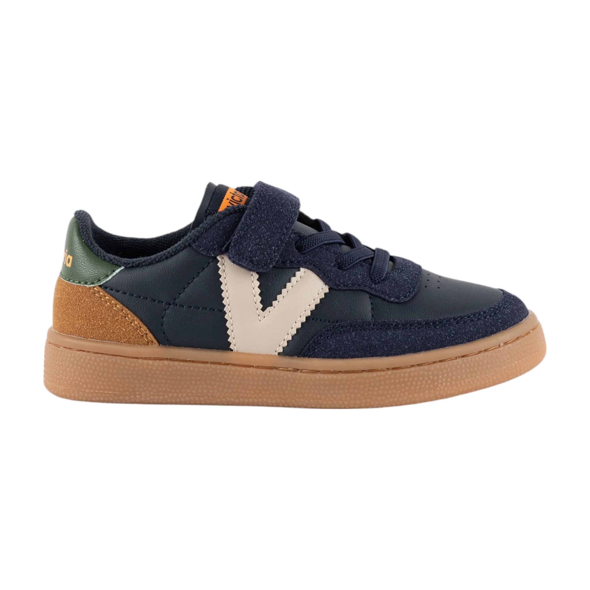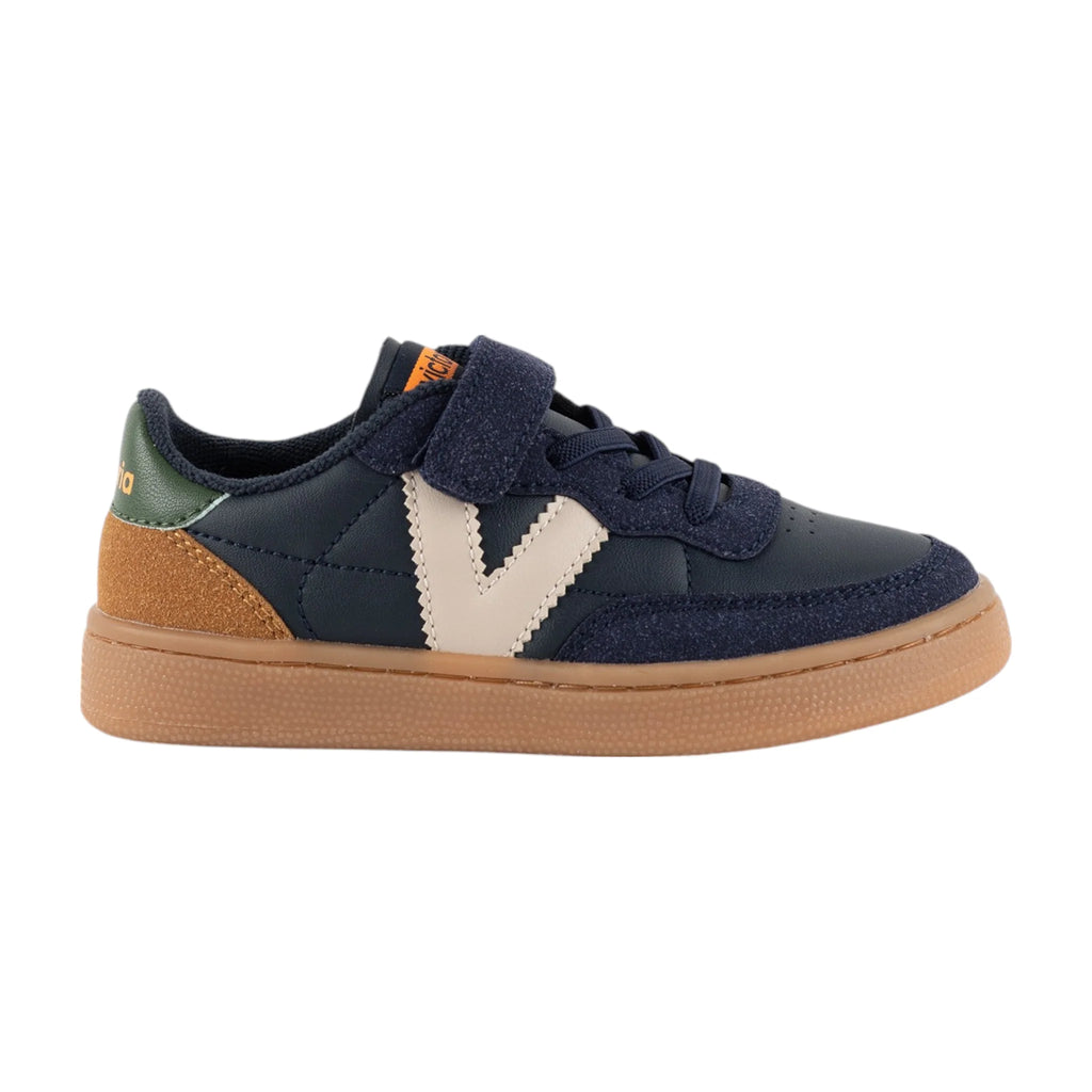 Children's sports shoes made from faux leather with tone-on-tone nubuck effect pieces for a modern and durable style. There is a colour detail on the side V and the back piece. Fastened with tone-on-tone elastic laces and a hook-and-loop strap for a comfortable fit and easy wear. The caramel-coloured sole adds a unique touch, completing the youthful and versatile design of these trainers.