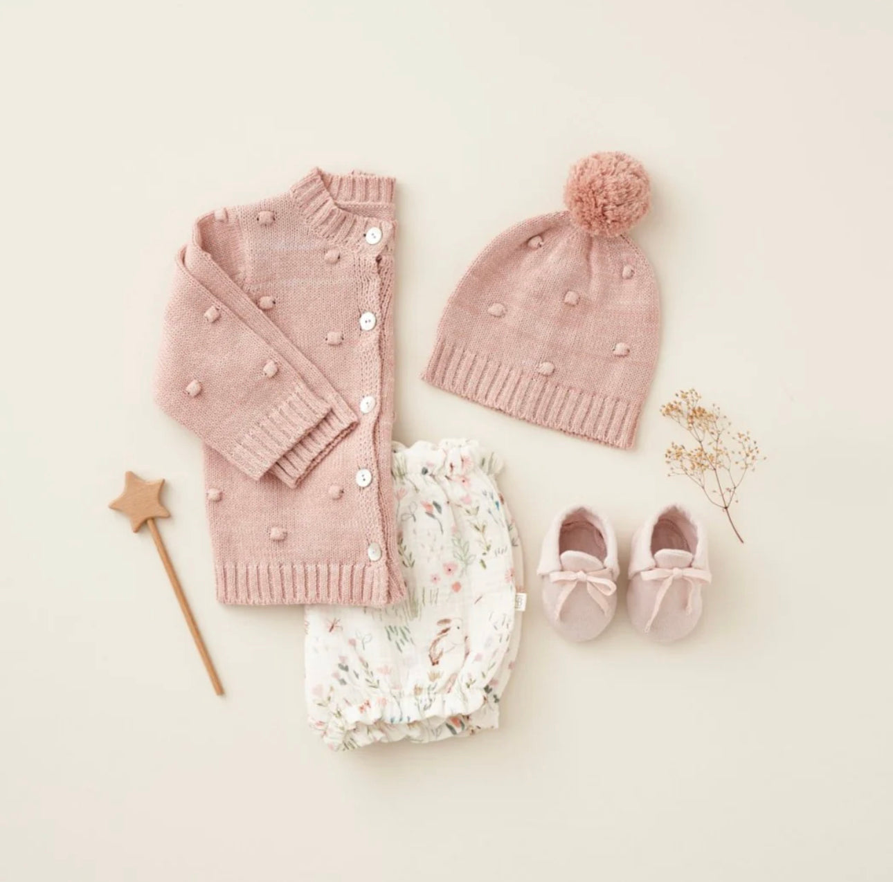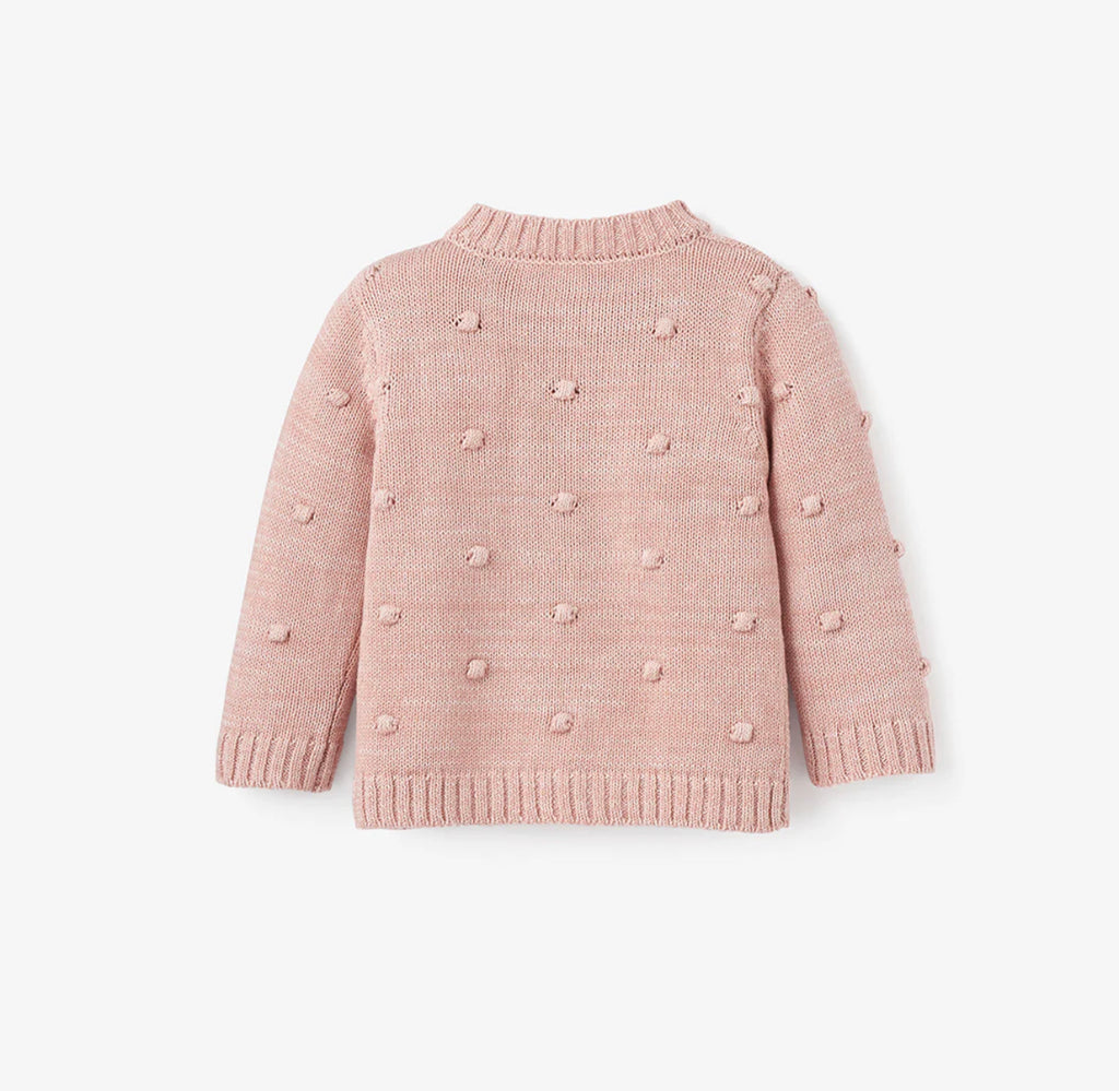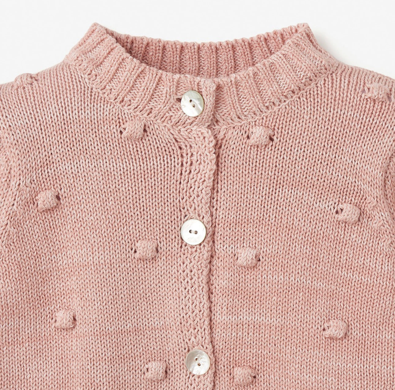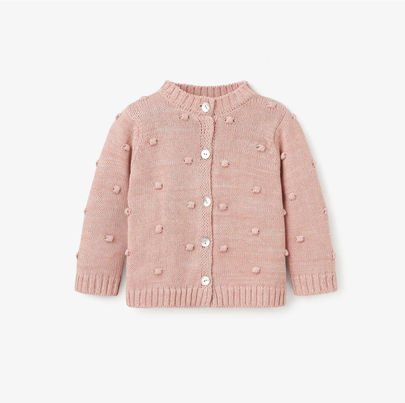 Elevate baby's sweater game with this textured, popcorn knit baby cardigan. Artfully designed in a funky 3D raised cotton knit, this knit baby sweater layers perfectly over any of our printed muslin styles.