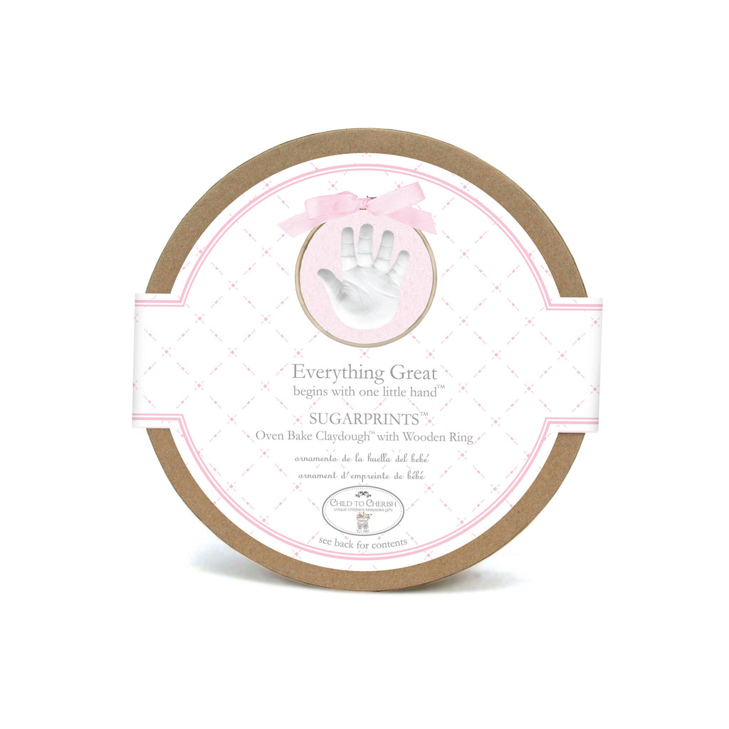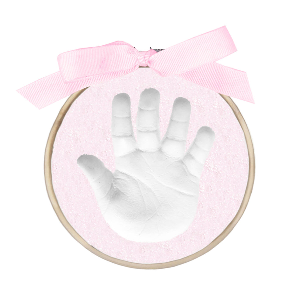 Marshmallow oven bake clay handprint kit includes: safe and non-toxic marshmallow air dry clay round cookie cutter hole punch rolling pin pink glitter pink ribbon