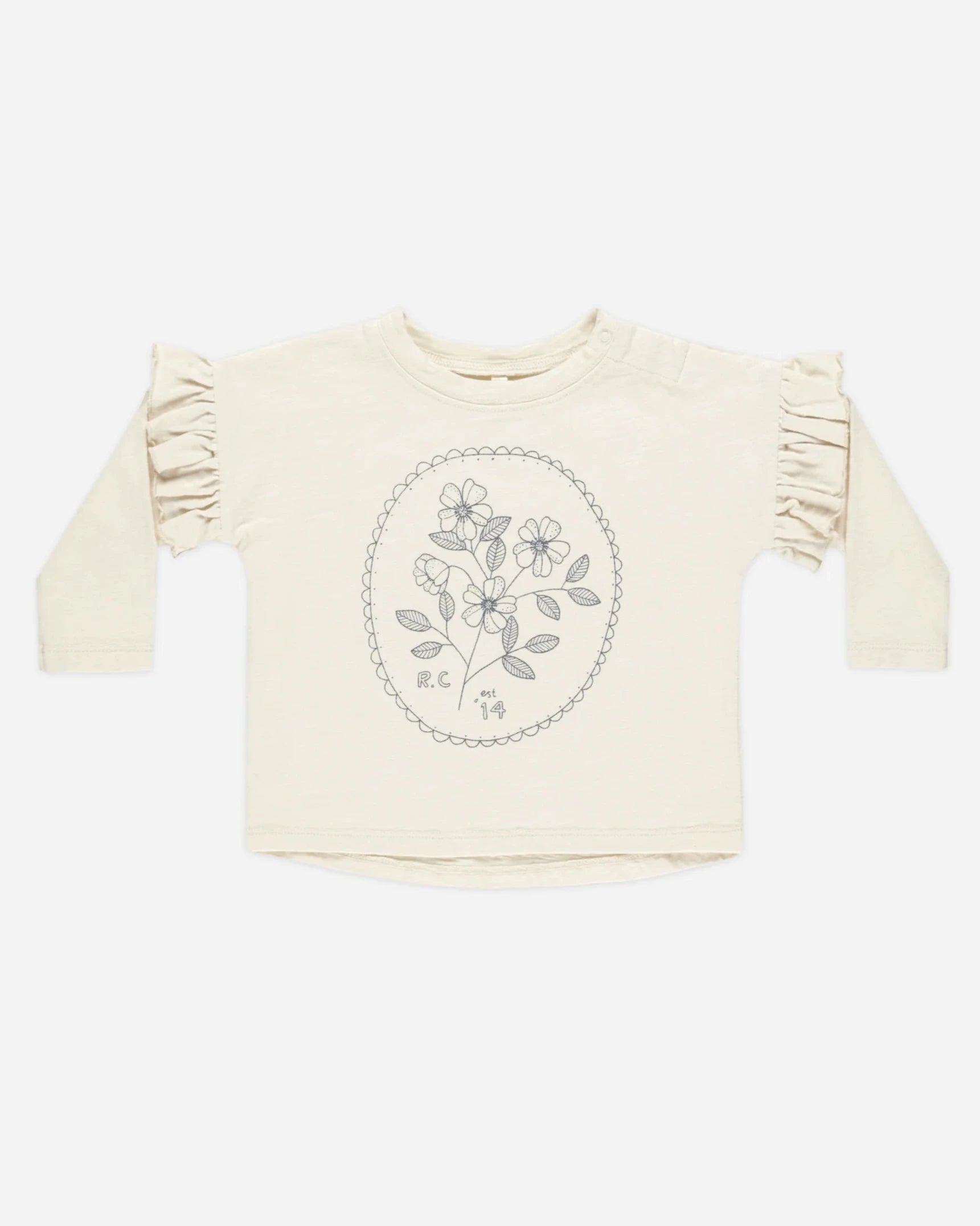Relaxed fit long sleeve crewneck tee made from the softest cotton slub fabric. Featuring a gentle curved hemline and ruffles near the shoulder. Baby sizes 0-3m thru 18-24m have snaps at the shoulder for easy changing.