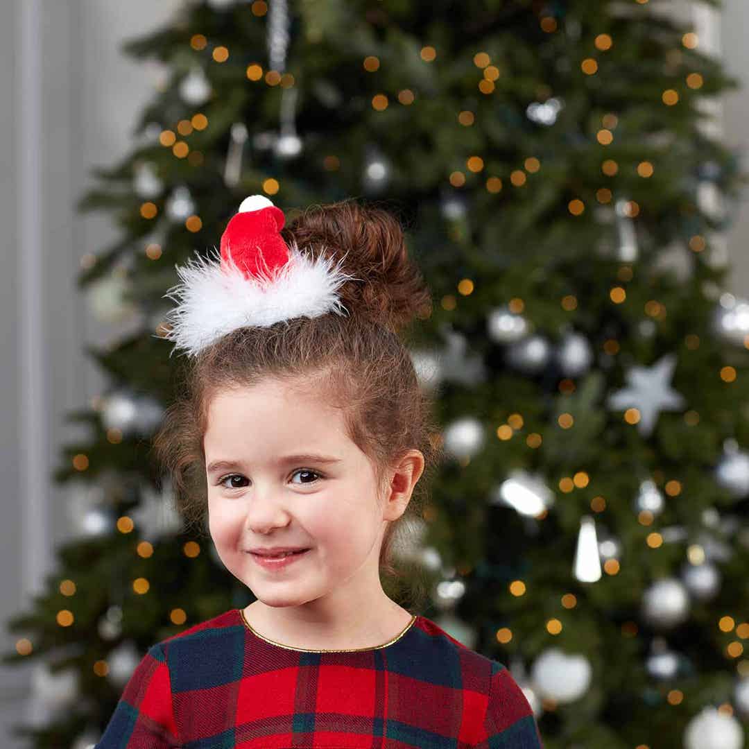Sing along with our musical velvet Santa hat. The velvet Santa hat hair clip has a jingle bell. This hair clip features a classic Santa hat look with feather details. This super cute clip also plays "Jingle Bells" when pressed. This is the perfect finishing touch for any Christmas activity and spreading the joy this holiday season.