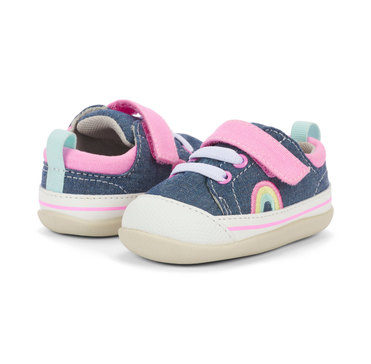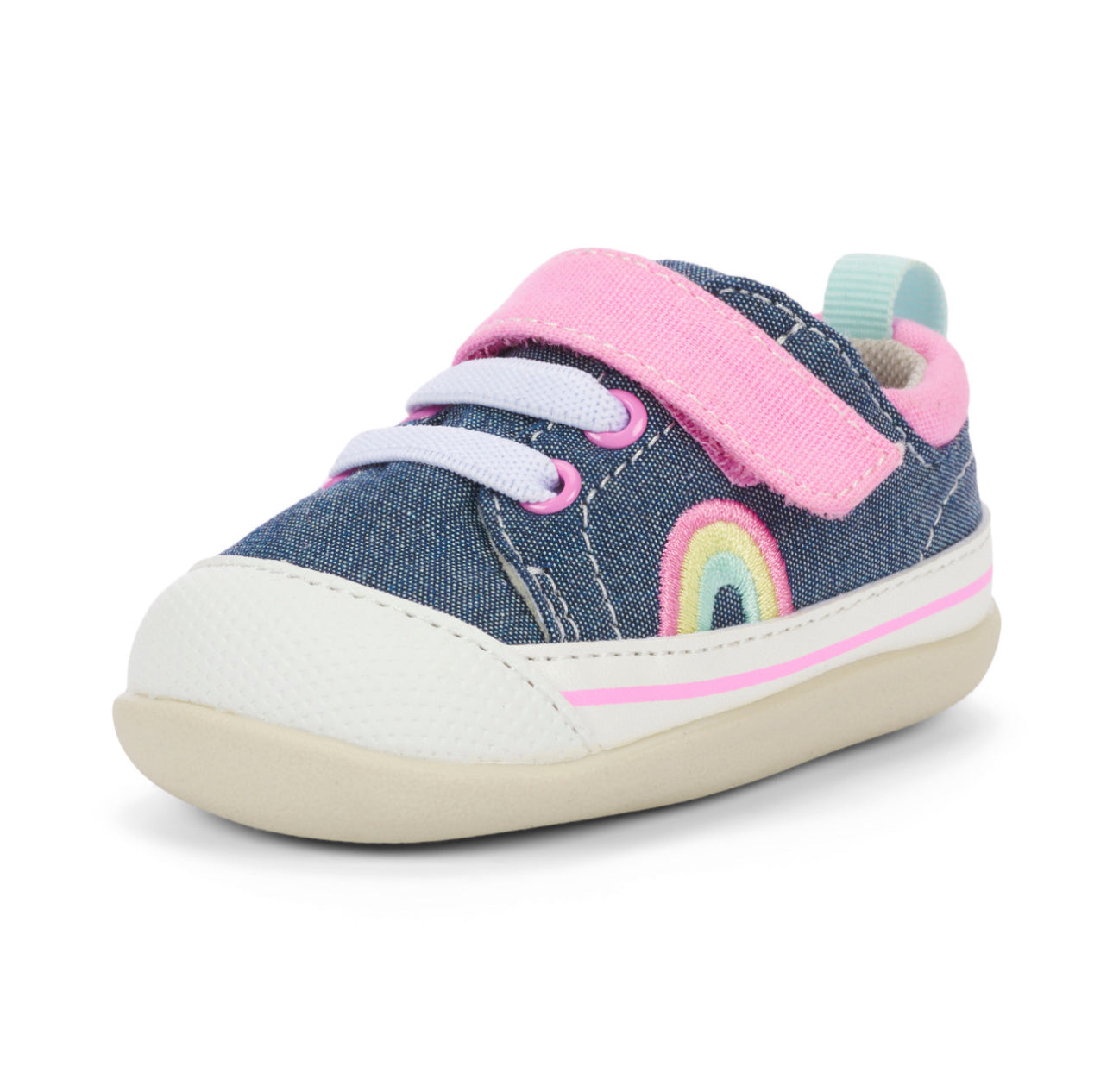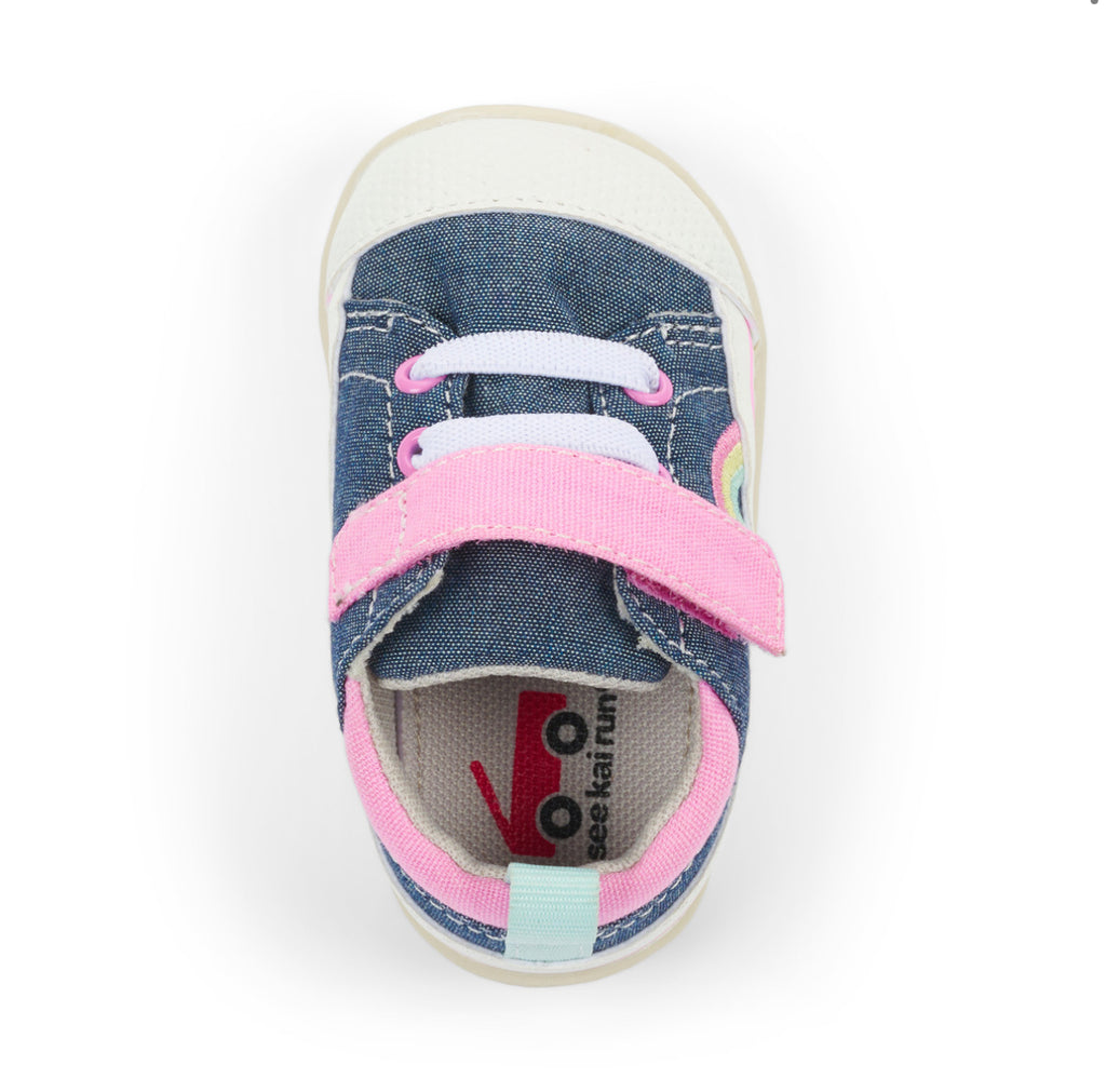 This first walker sneaker in blue chambray is the perfect choice for little ones starting to walk. Lightweight and flexible, with a padded collar and playful rainbow embroidery, these sneakers offer comfort and style.