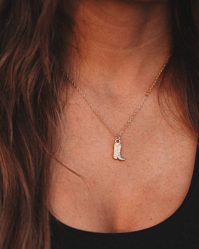 The Stride Necklace is beautifully crafted and adjustable from 16"-18". This is a gorgeous matte gold color and will be the perfect necklace alone or layered with your other favorite necklaces. You will love the perfect sized cowgirl boot hanging from the sturdy chain.  This coordinates with our Stride hair tie bracelet set.