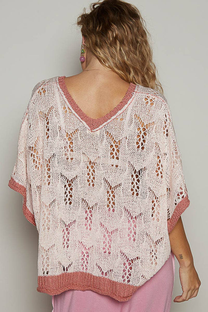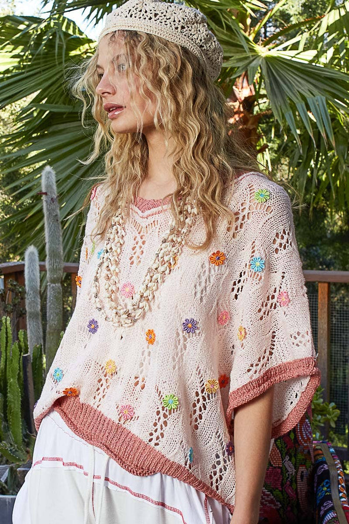 Designed in V-neck sleeveless sweater top in acrylic with flower point, outseam and rolling edge, color blocked band point, solid color (The flower color is random).