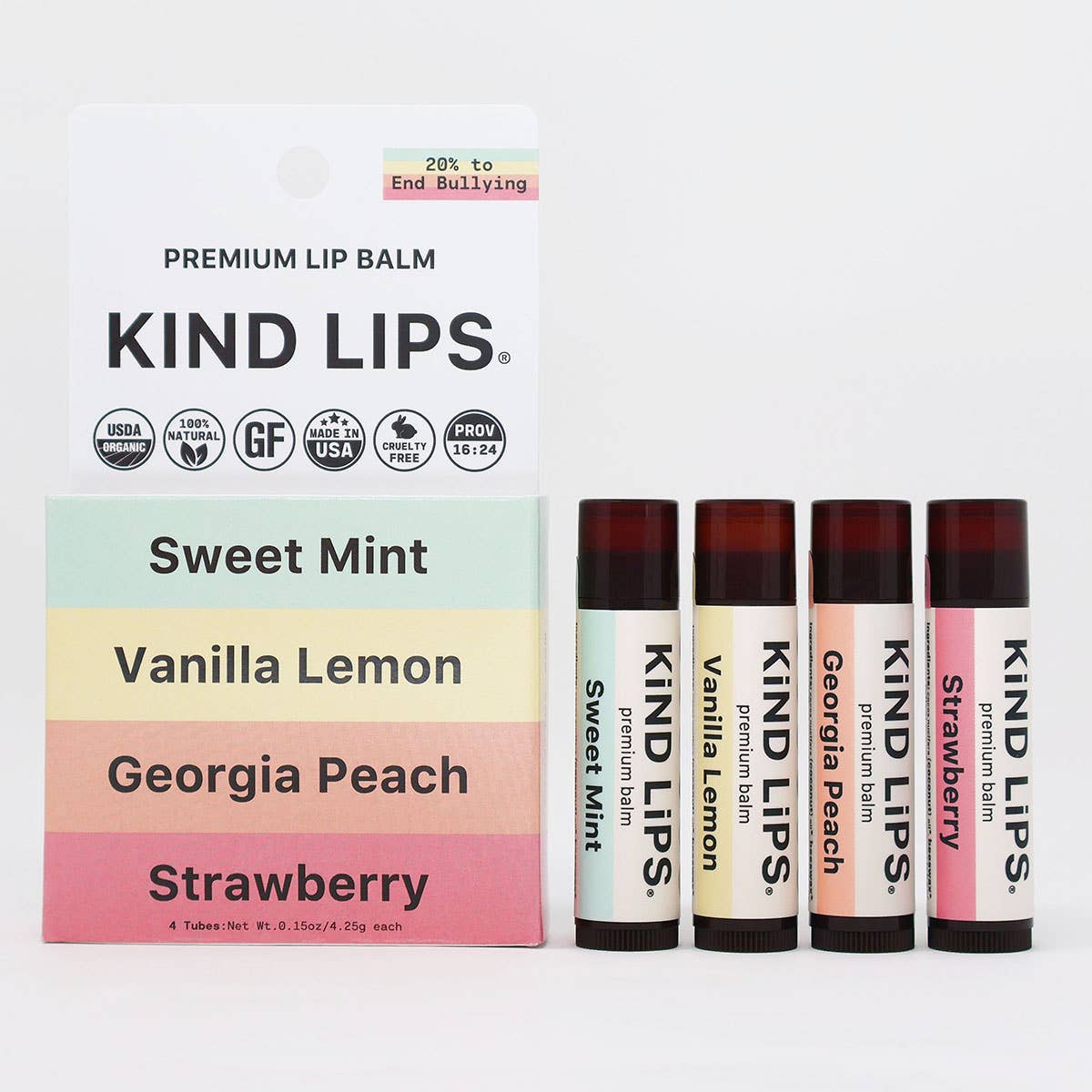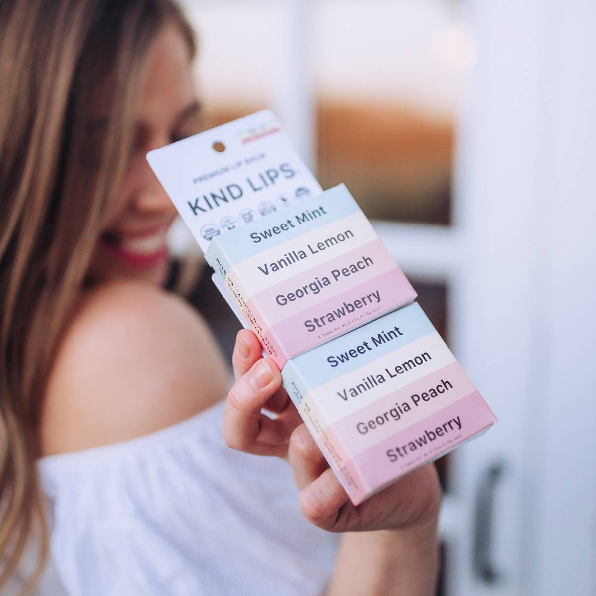 Our top selling lip balm flavors in one amazing little box. The variety 4 pack box includes: Sweet Mint, Vanilla Lemon, Georgia Peach, and Strawberry.