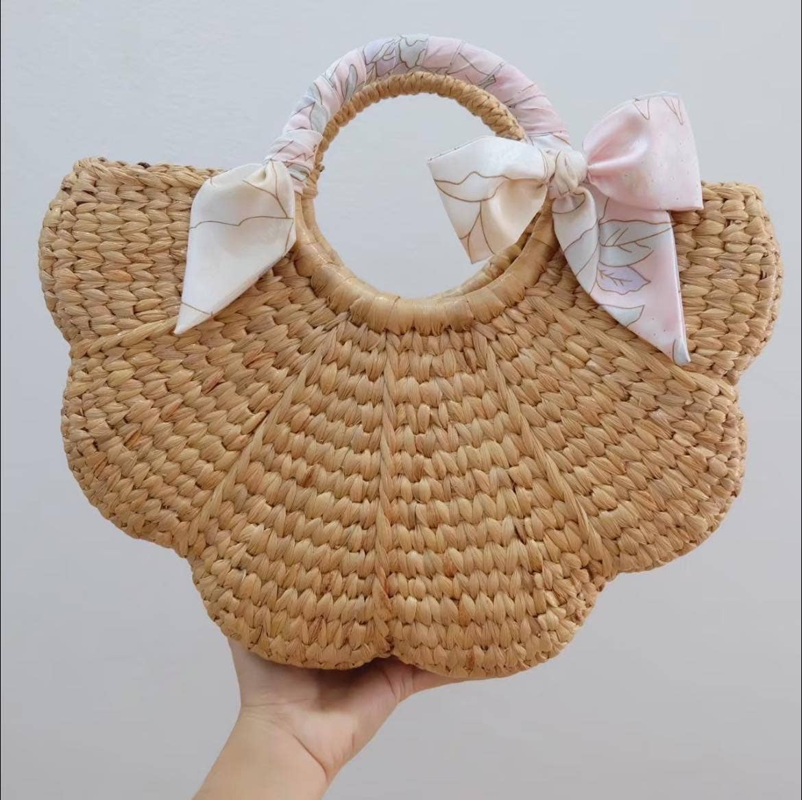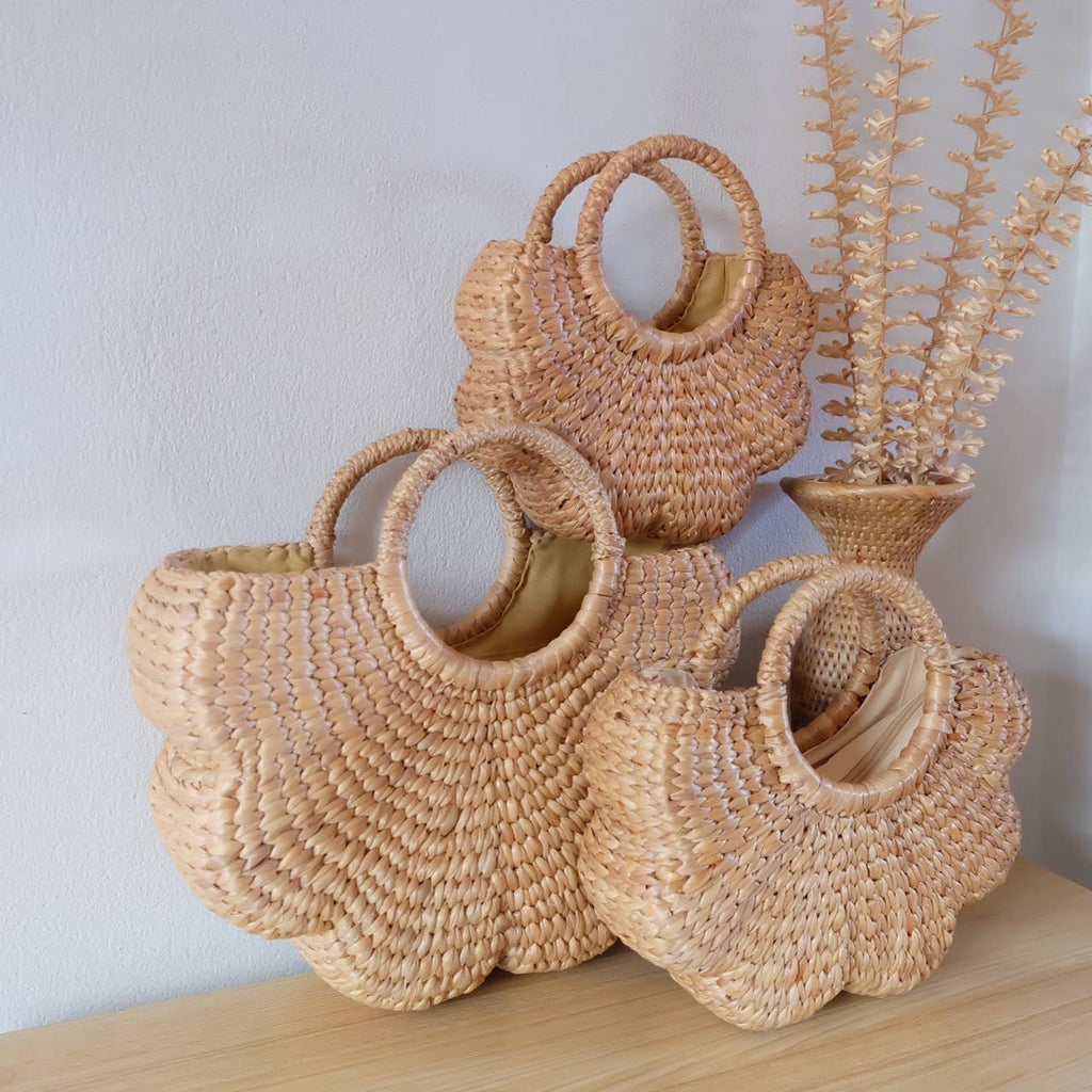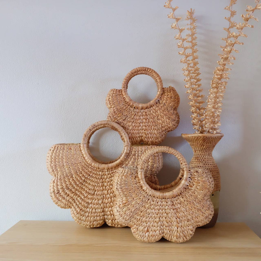 Brand: Linchawa Dimensions: Large - L 13" x H 9", Medium - L 10" x H 7", Small - L 8" x H 6" Materials: 100% Water Hyacinth - Elevate your style with our flower shaped hand bag, a stunning accessory that captures the essence of nature. The intricate flower design adds a touch of botanical beauty to your ensemble. - Each piece is 100% handwoven from sustainable water hyacinth by Thai artisans - By choosing our bag, you're also making a conscious decision for ethical and sustainable fashion. Embrace a stylish accessory that not only complements your outfit but also contributes to a greener, more eco-conscious lifestyle. - Available in 3 sizes Linchawa is a brand from Phayao, Thailand. The brand is a collective of 20 local skilled artisans. Each product is meticulously crafted with love by talented artisans who take pride in preserving traditional technique.