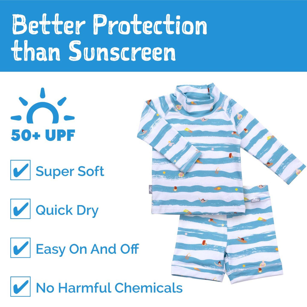 Jan & Jul rash guard set protects your little ones from the sun: whether they are in the water or at the beach, at the water park or at the back yard! • UV Protection: 50+ UPF all day sun protection, wet or dry, blocking 98% of sun’s harmful UV rays • No Harmful Chemicals: UV sun protection comes from the weave of the fabric and does not wash off after many washes • Comfortable: Soft, cool-to-touch quick-drying fabric with low water absorption • Kid Friendly: High wide neck for easy on and off. High quality stretchy fabric • 2-Piece: For easy washroom breaks • Stylish: Raglan cut & flat lock seams in stylish designs loved by children
