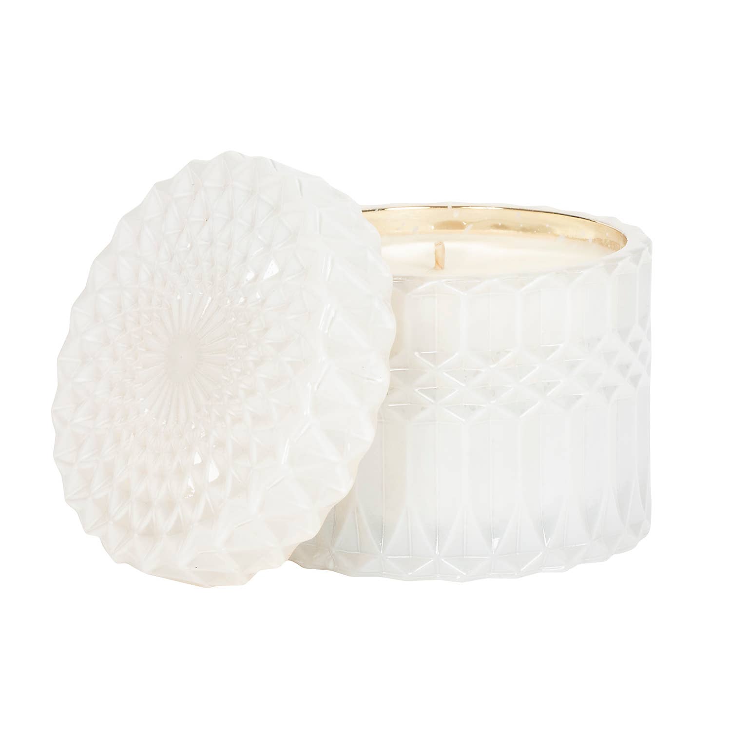 This beautiful shimmer candle comes in an opaque white 8oz multi-faceted, cut glass vessel.